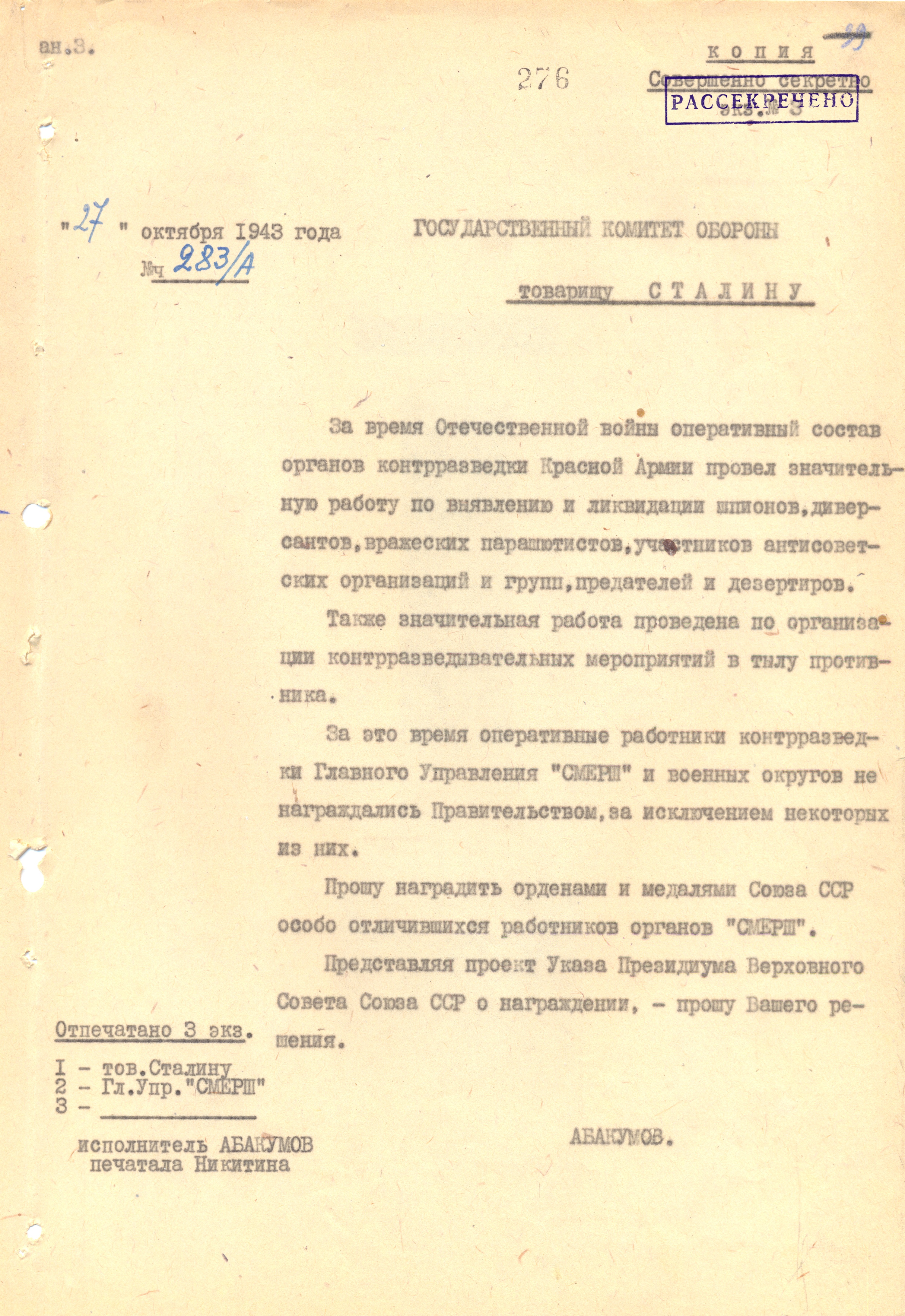 Докладная записка Абакумова — Сталину о награждении отличившихся сотрудников органов «Смерш». Фото: Центральный архив ФСБ России