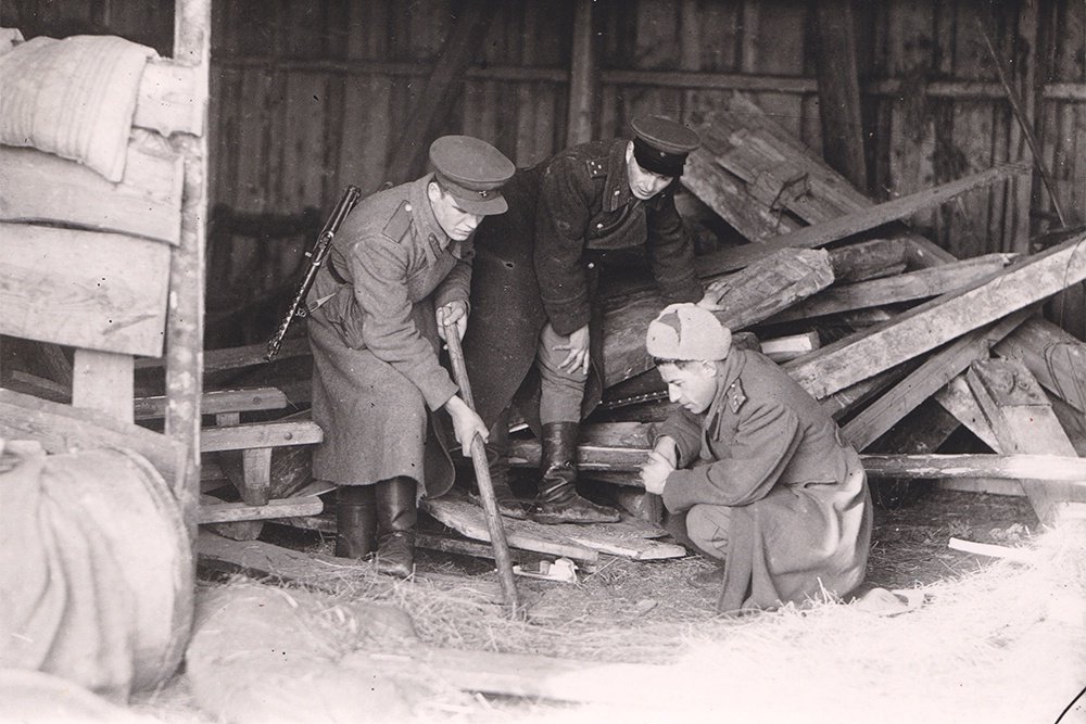 Сотрудники УКР «Смерш» 3-го Прибалтийского фронта вскрывают тайник с оружием латышских националистов. Фото: Центральный архив ФСБ России