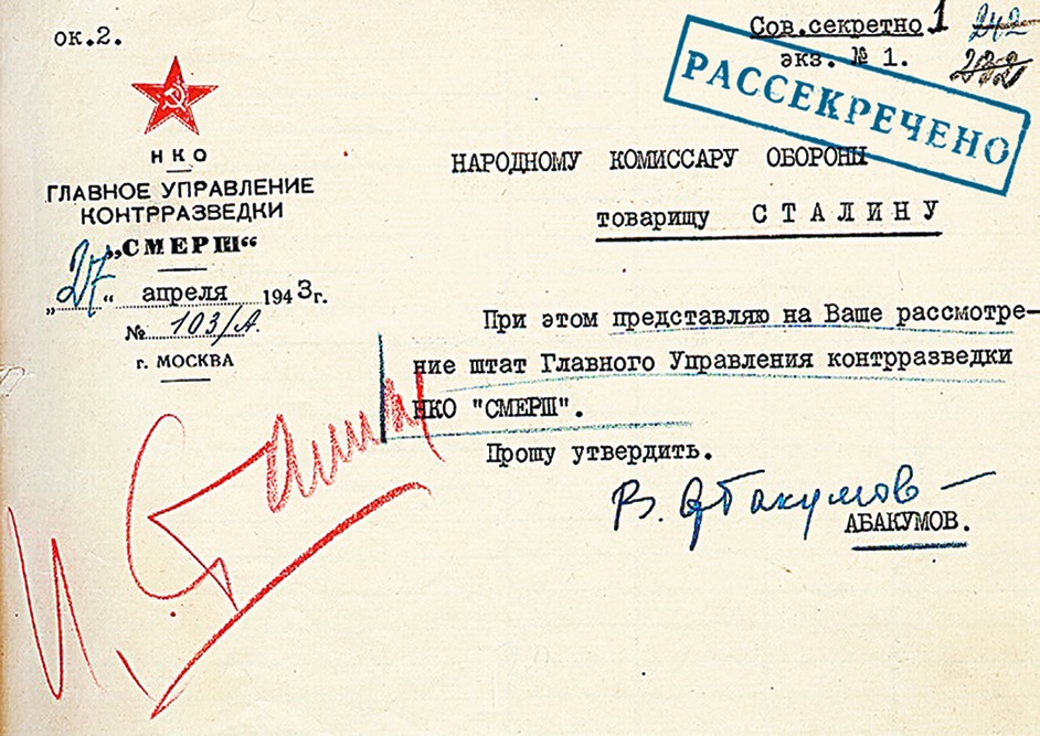 Уже через неделю после создания ГУКР «Смерш» Виктор Абакумов направил Сталину на утверждение его штат. Фото: Центральный архив ФСБ России