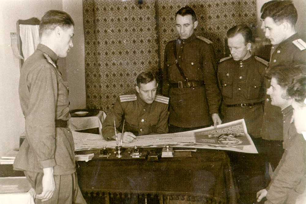 Редколлегия стенгазеты 1-й Московской школы ГУКР НКО «Смерш» за работой. Второй слева — начальник курса майор Дворянчиков В.А. Фото: Из личного архива ветерана «Смерш» В.А. Дворянчикова