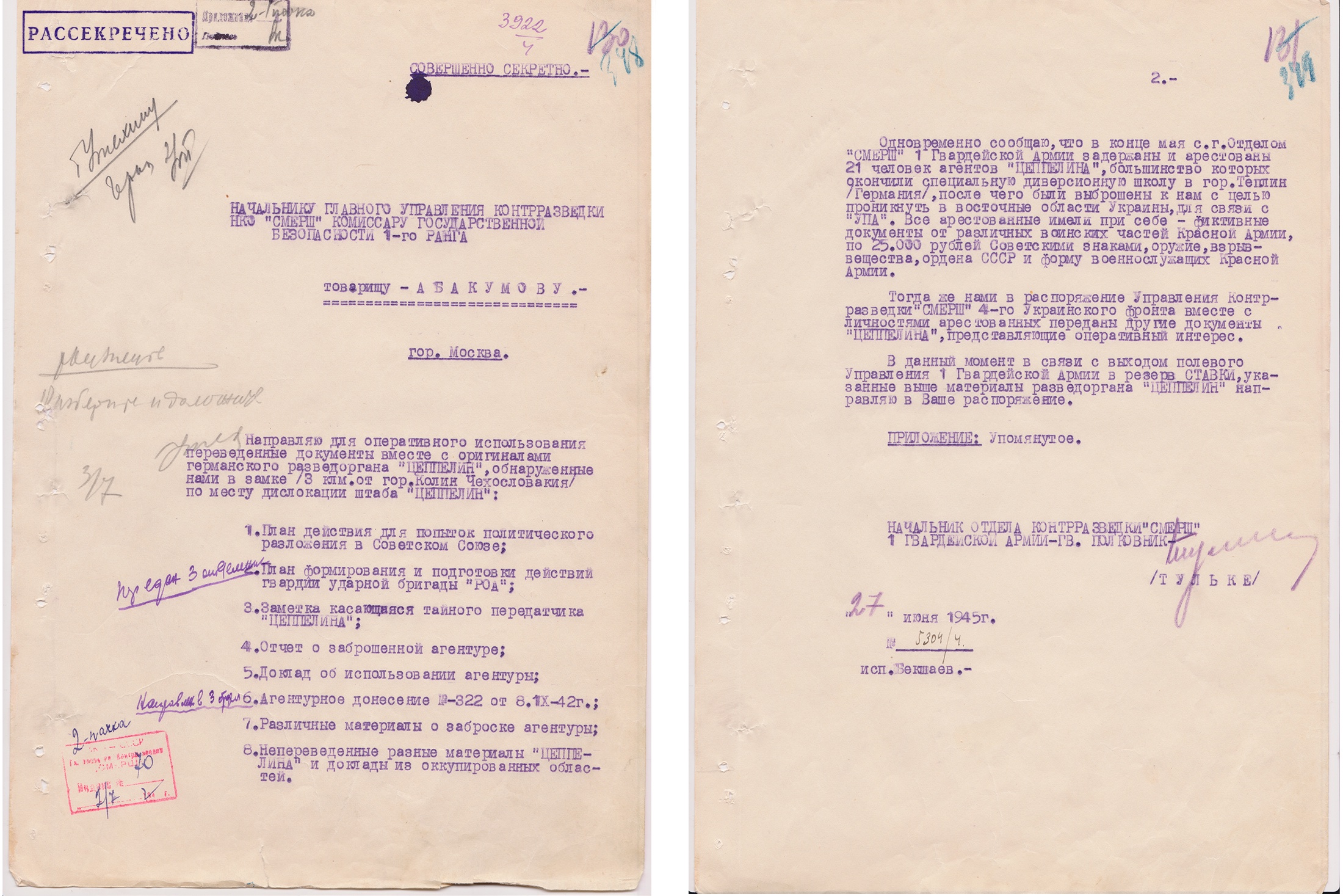 Только к празднованию 80-летия «Смерш» Департаментом военной контрразведки рассекречено 267 документов на 1354 листах. Один из рассекреченных документов повествует об обнаружении в чешском средневековом замке, где располагалось подразделение германского разведывательного органа «Цеппелин», материалов, содержащих планы гитлеровцев по политическому разложению Советского Союза.
