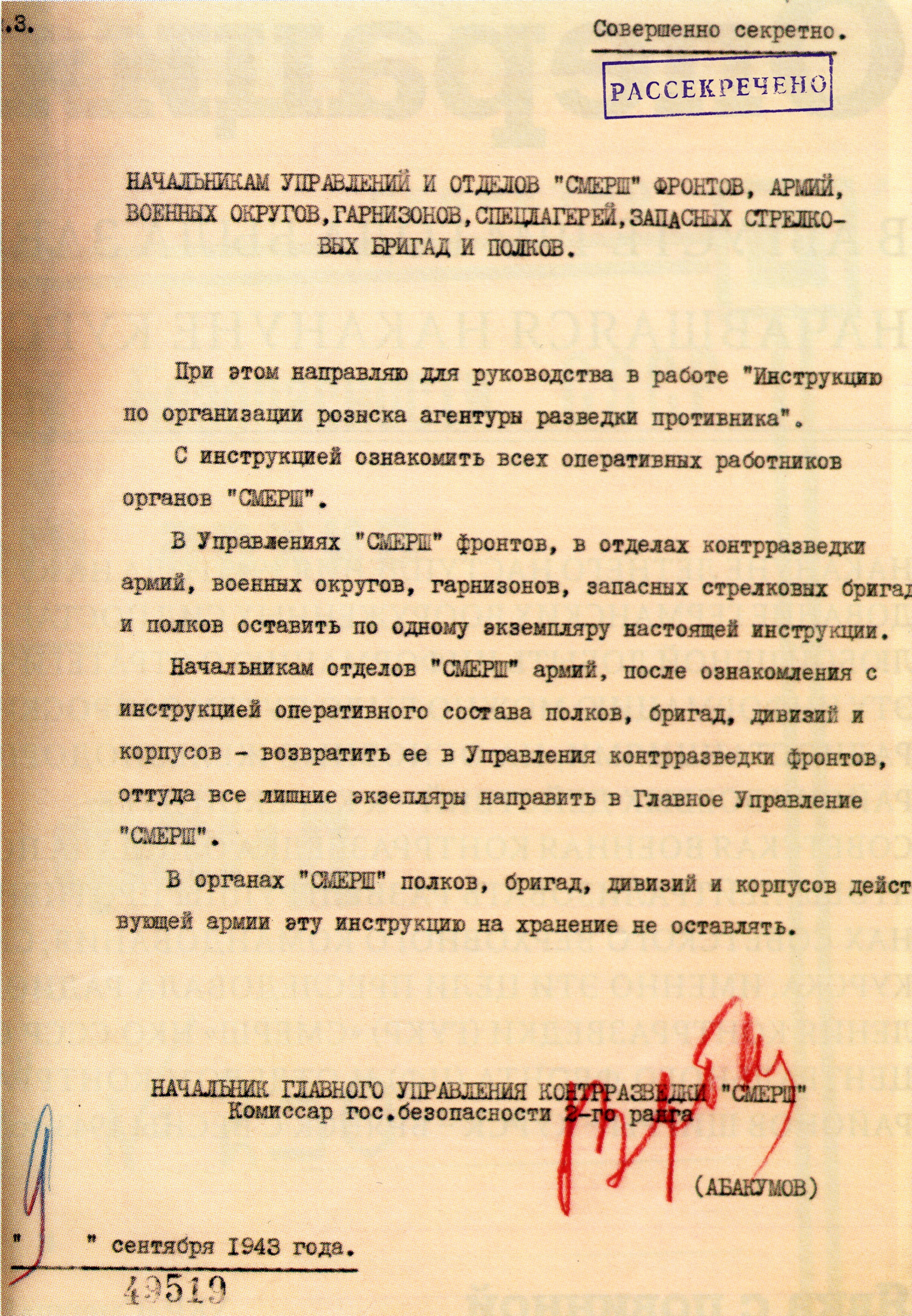 Инструкция «Смерш» по организации розыска агентуры разведки противника. Фото: Центральный архив ФСБ России