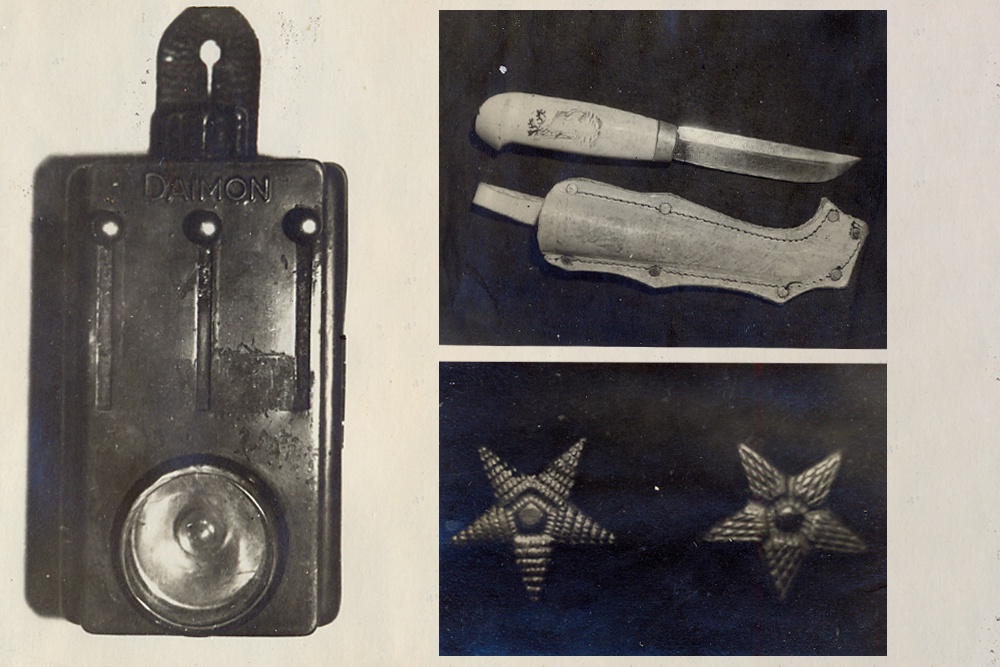 Слева: Фонарик немецкого агента для подачи световых сигналов и наведения авиации. Справа сверху: Финский нож не входил в экипировку красноармейцев, в отличие от заброшенных диверсантов. Справа снизу: Как можно было вычислить шпиона: слева наша звездочка, справа — изготовленная в Германии. Фото: Центральный архив ФСБ России