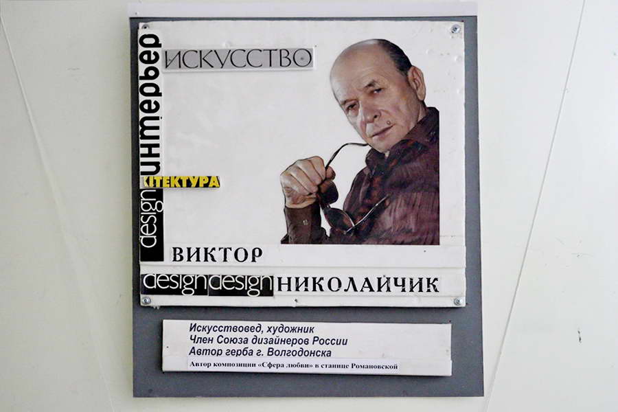 Волгодонску везет на талантливых людей. Спортсмены, артисты, политики, художники… Кого-то город вырастил, кому-то стал вторым домом, заботливо предоставив жилье и работу. Дизайнер, художник Виктор Иосифович Николайчик — один из тех, кто, однажды приехав в Волгодонск, стал его гордостью. Он награжден почетными знаками «За заслуги перед городом Волгодонском» и «80 лет Ростовской области». А известен Виктор Иосифович своими авторскими работами. Среди них герб и флаг Волгодонска, по его словам, лучшая композиция «Сфера любви» в станице Романовской, дизайнерские проекты мемориалов-захоронений ветеранов Великой Отечественной войны в Волгодонске и станице Дубовской и много других.