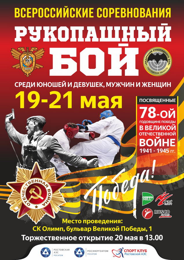 С 19 по 21 мая в Волгодонске в спортивном комплексе «Олимп» пройдет одно из самых масштабных спортивных мероприятий города — Всероссийские соревнования по рукопашному бою среди юношей и девушек, мужчин и женщин, посвященные 78-й годовщине Великой Победы.