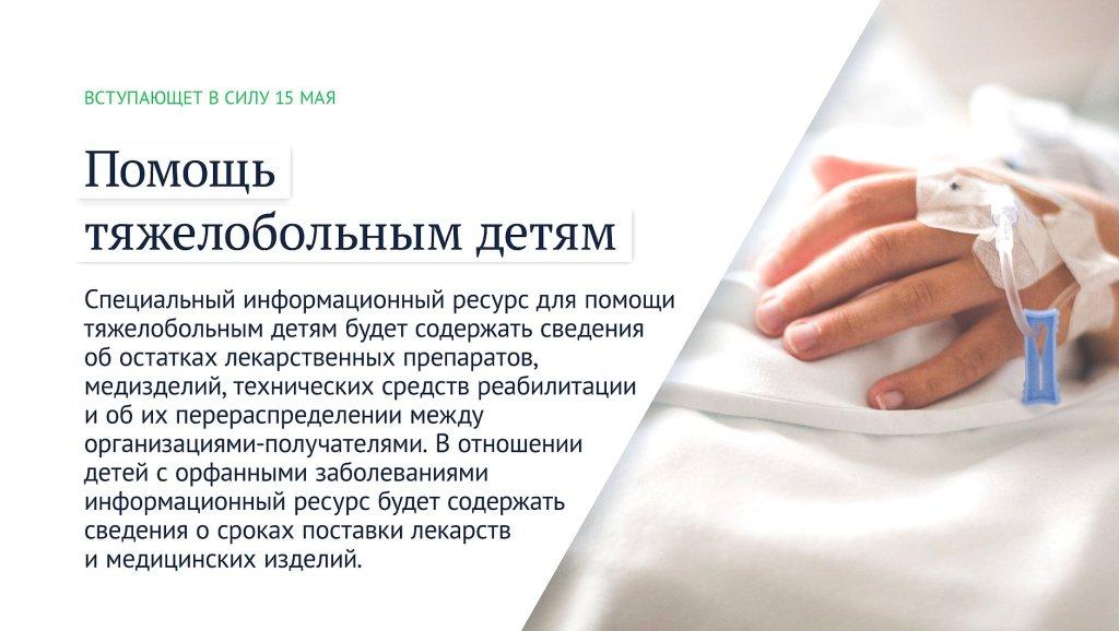 Специальный информационный ресурс для помощи тяжелобольным детям будет содержать сведения об остатках лекарственных препаратов, медизделий, технических средств реабилитации и об их перераспределении между организациями-получателями. В отношении детей с орфанными заболеваниями информационный ресурс будет содержать сведения о сроках поставки лекарств и медицинских изделий.