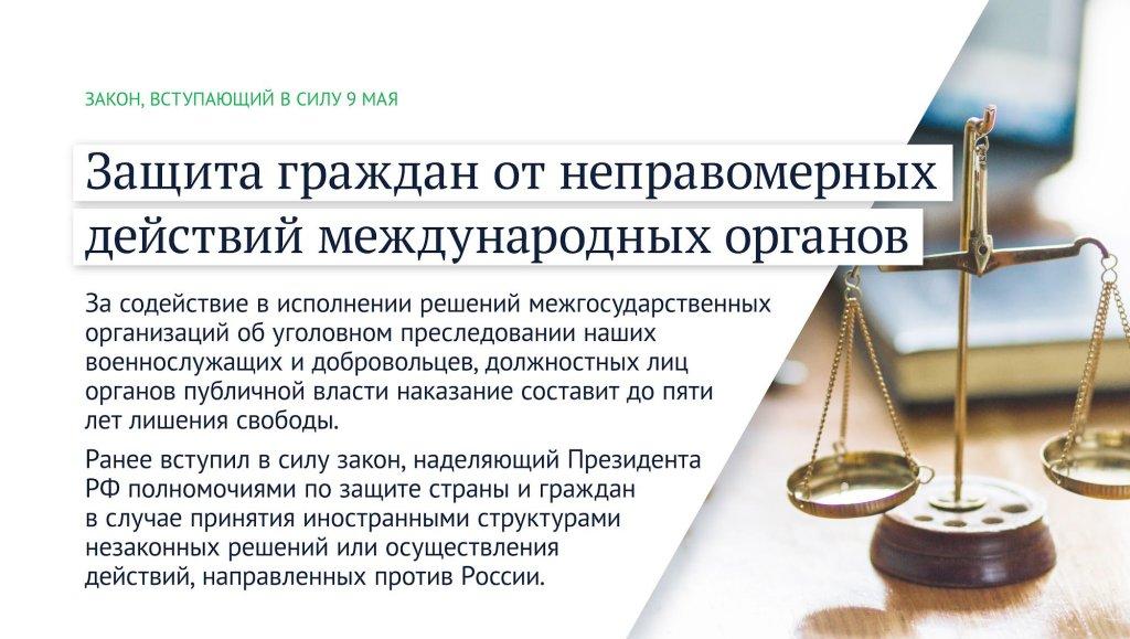 Ранее вступил в силу закон, наделяющий Президента РФ полномочиями по защите страны и граждан в случае принятия иностранными структурами незаконных решений или осуществления действий, направленных против России.