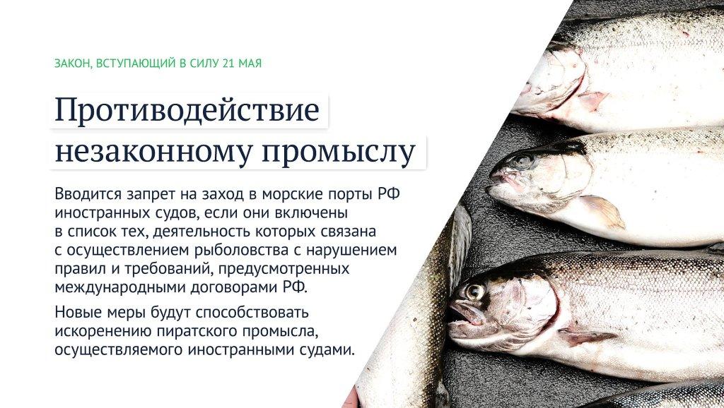 Вводится запрет на заход в морские порты РФ иностранных судов, если они включены в список тех, деятельность которых связана с осуществлением рыболовства с нарушением правил и требований, предусмотренных международными договорами РФ.