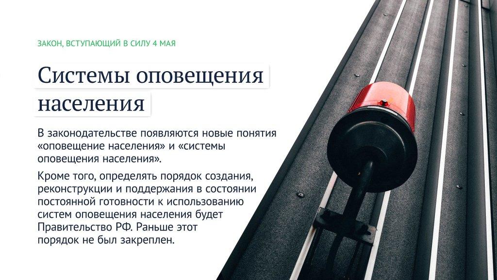 Кроме того, определять порядок создания, реконструкции и поддержания в состоянии постоянной готовности к использованию систем оповещения населения будет Правительство РФ. Раньше этот порядок не был закреплен.