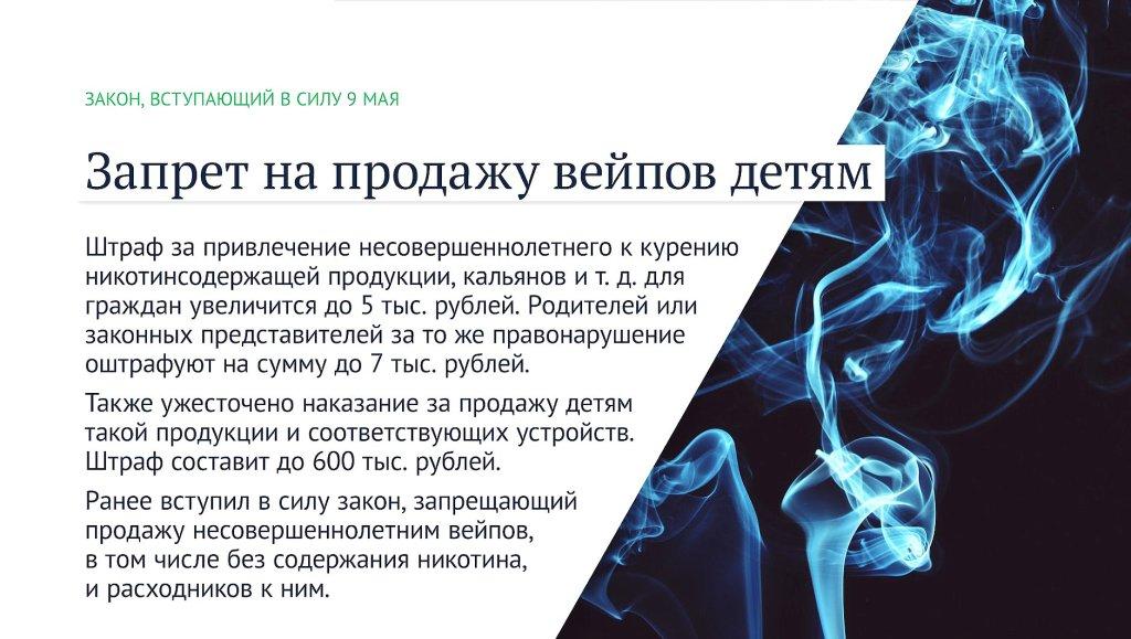 Ранее вступил в силу закон, запрещающий продажу несовершеннолетним вейпов, в том числе без содержания никотина, и расходников к ним.