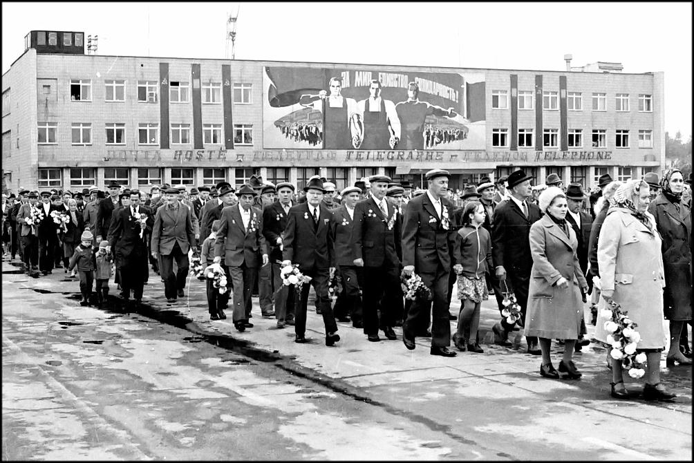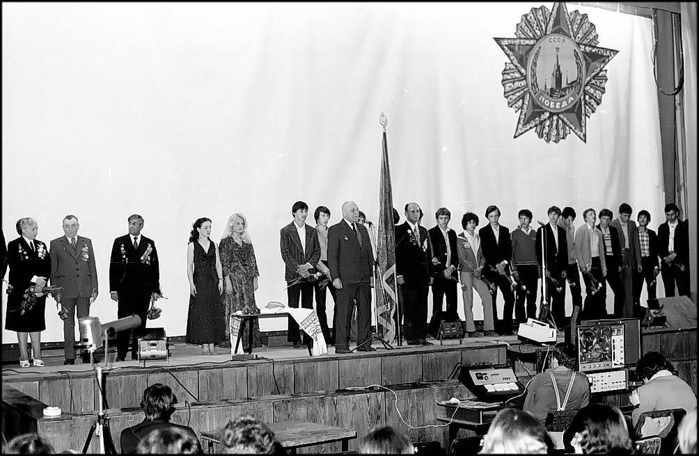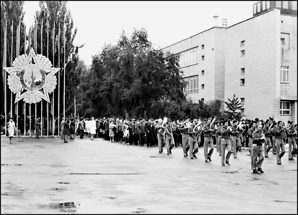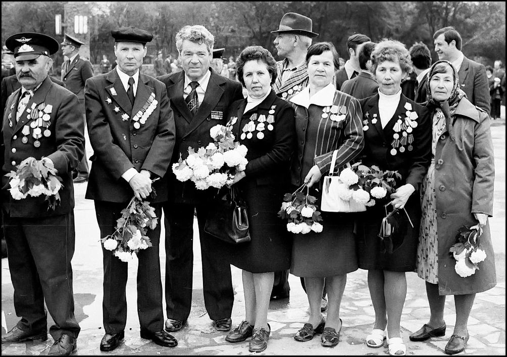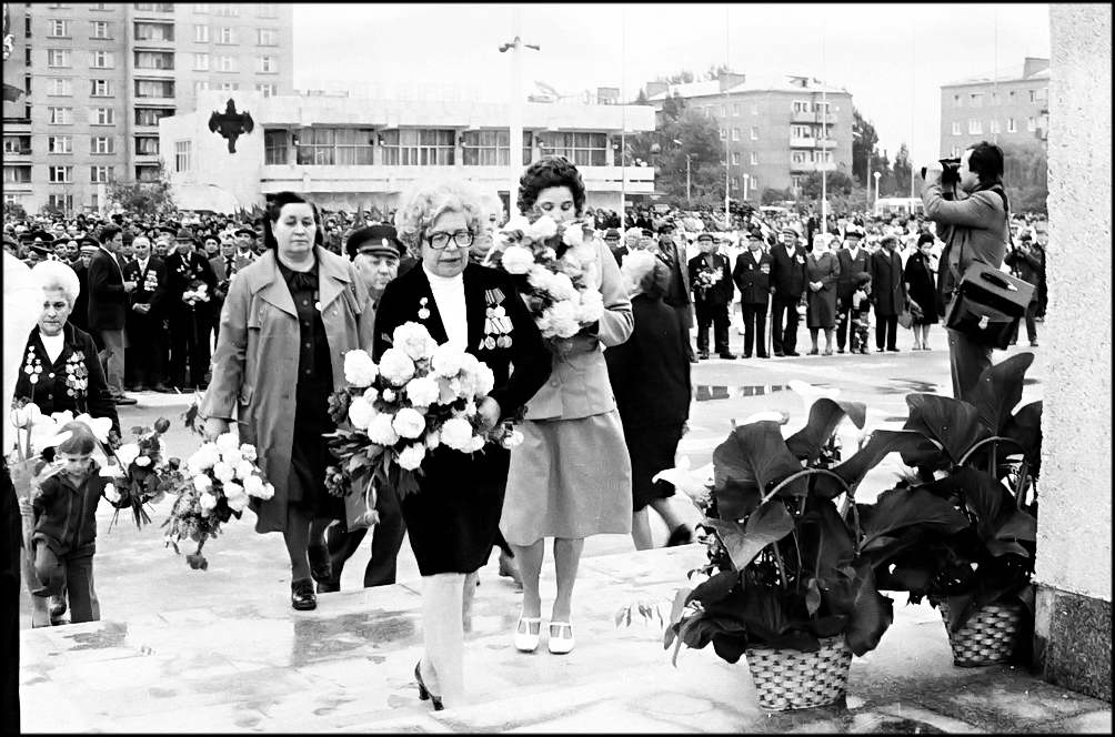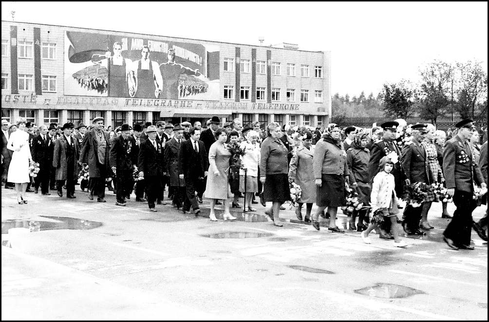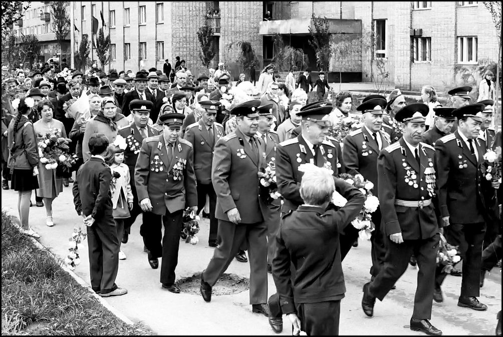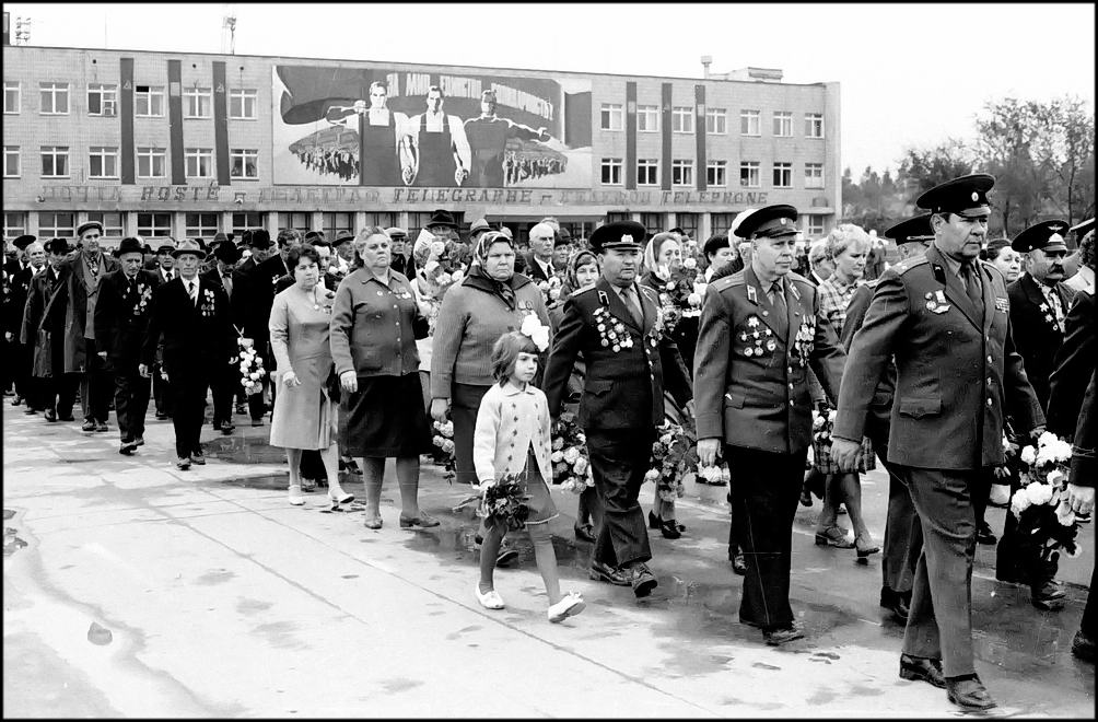Колонна ветеранов выстраивается в центре площади. На трибуне— члены бюро горкома КПСС, горисполкома, ветераны. От имени бюро горкома КПСС, горисполкома, горкома ВЛКСМ ветеранов тепло поздравил первый секретарь ГК КПСС А. Е. Тягливый.