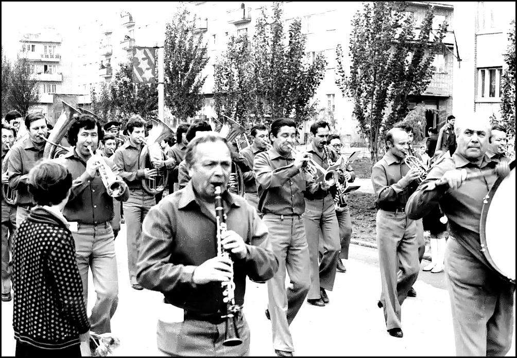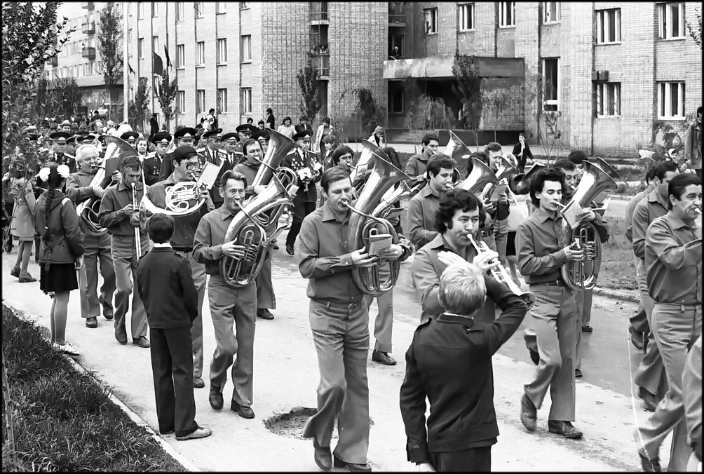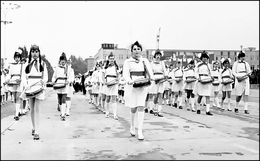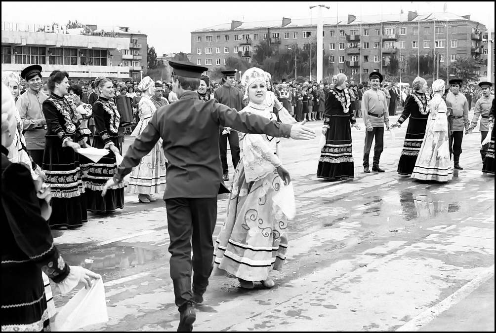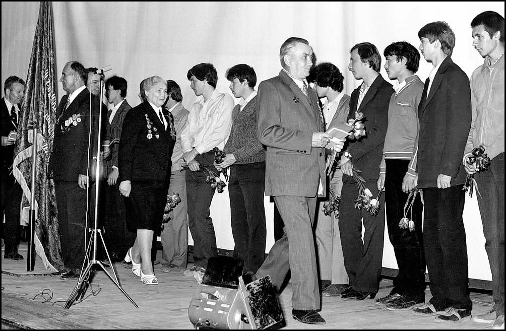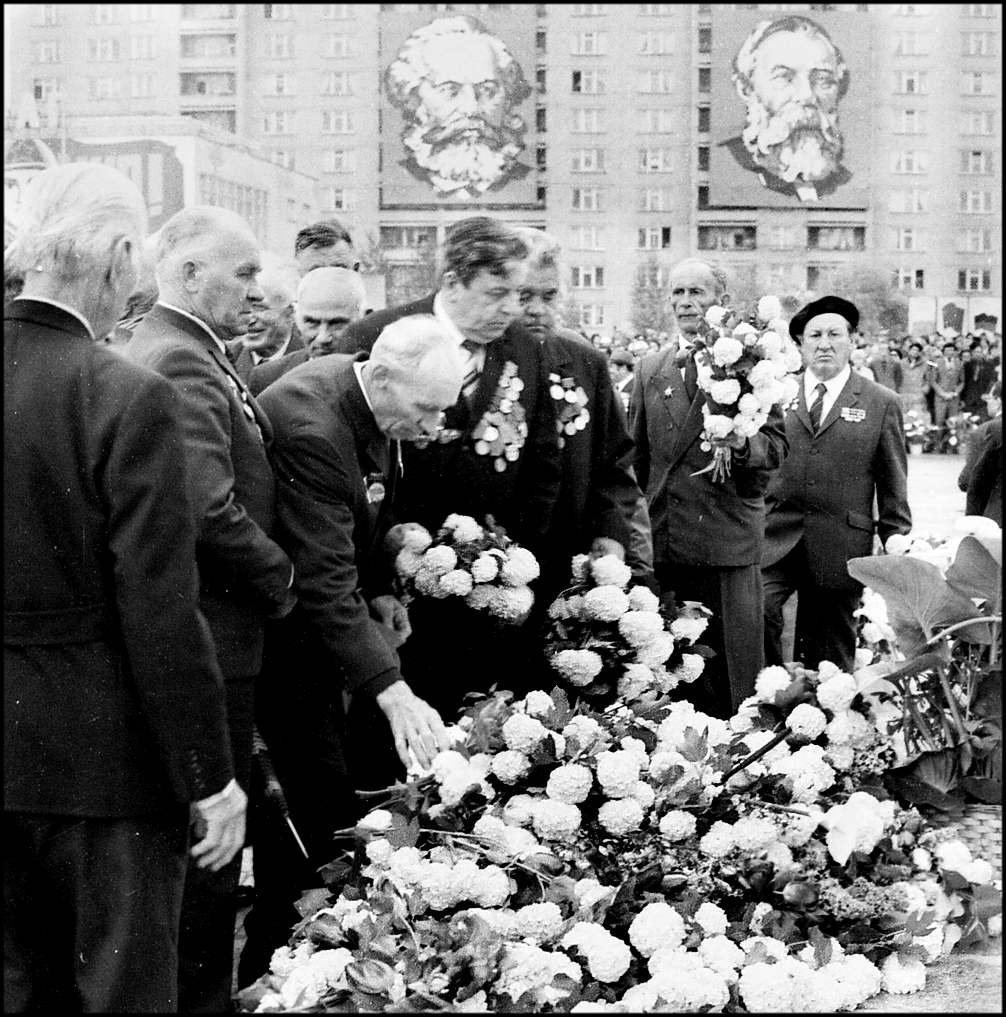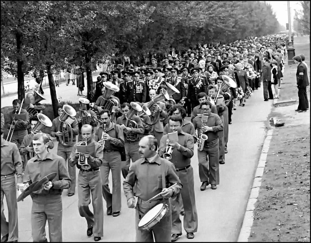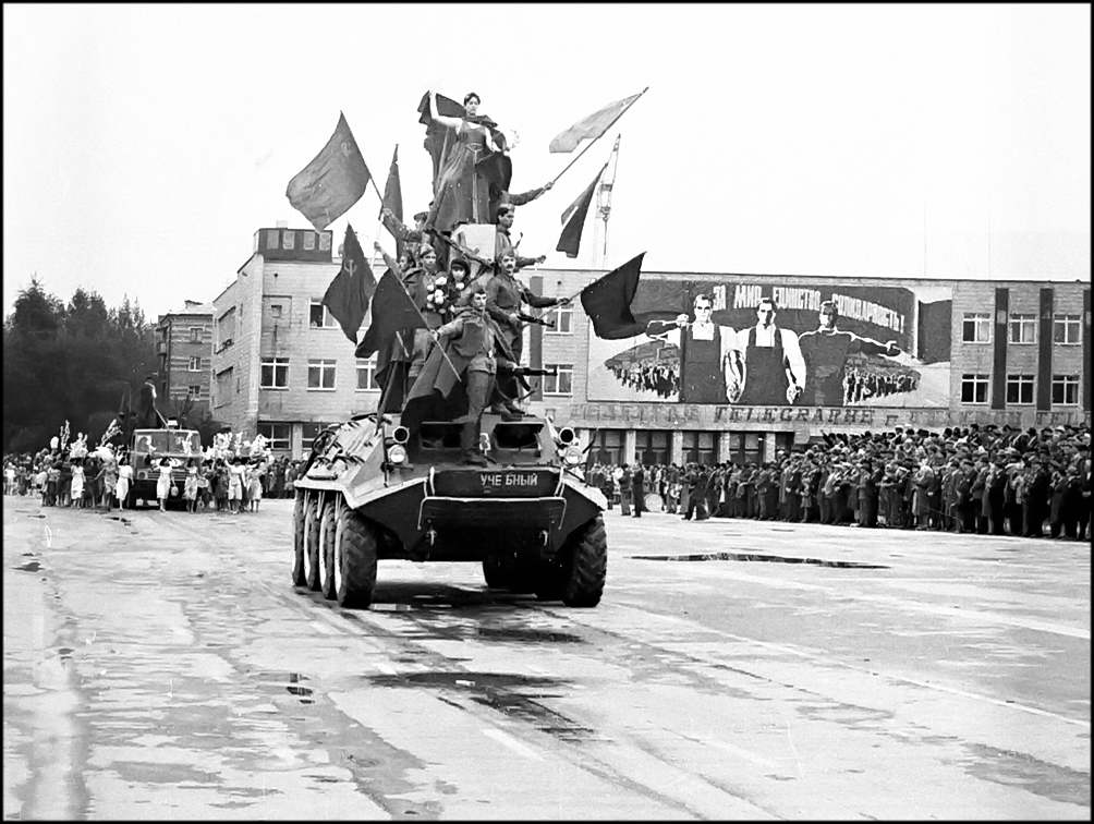 Колонна ветеранов выстраивается в центре площади. На трибуне— члены бюро горкома КПСС, горисполкома, ветераны. От имени бюро горкома КПСС, горисполкома, горкома ВЛКСМ ветеранов тепло поздравил первый секретарь ГК КПСС А. Е. Тягливый.