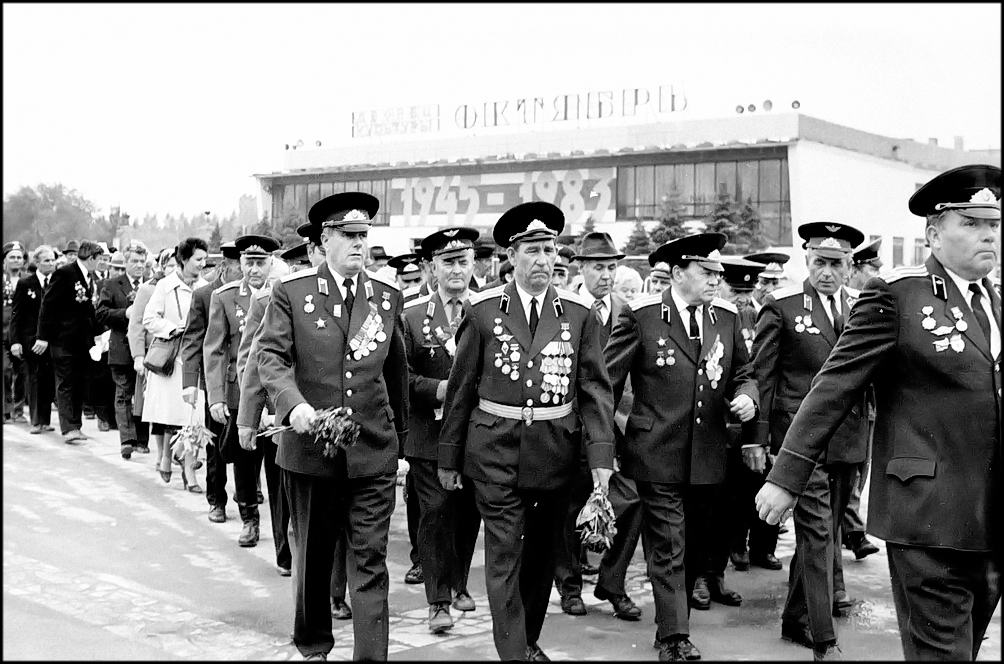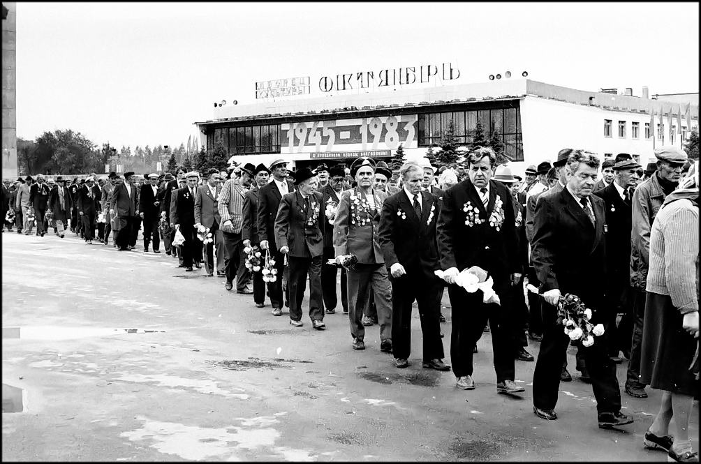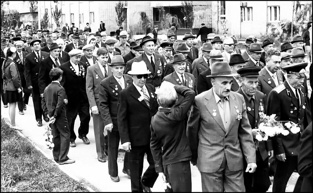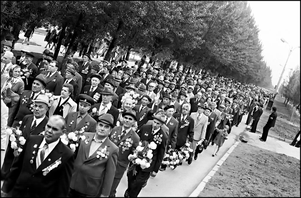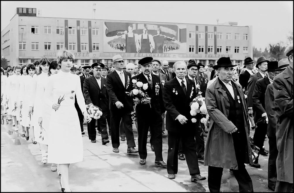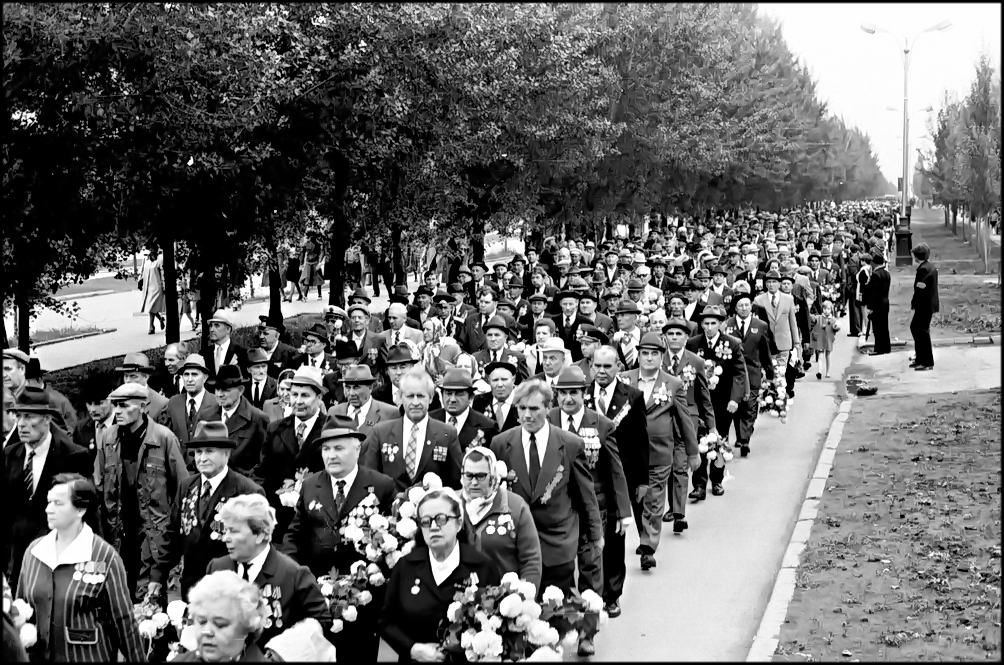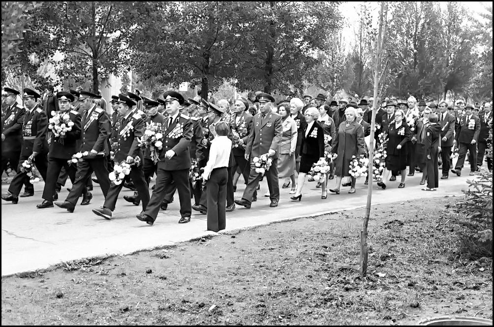 Внимание! Говорит площадь Победы! Сегодня, 9 мая 1983 года, — 38-я годовщина Победы советского народа над фашистской Германией… И замерла в торжественном убранстве обновленная площадь города. Под звуки духового оркестра к ней направляется колонна ветеранов. ОНИ идут, как всегда, чеканя шаг, четко держа равнение. Идут по знакомым улицам города люди, которые прошли через горечь утрат, слезы, беды, через дни в свинцовой душной мгле. Люди, которые принесли миру победу от коричневой чумы. Идут ветераны… И блестят глаза от слез у старушек в черных платках:» «Здоровья вам, сынки». А перед глазами, устремленными вдаль, — стоят лица сыновей, мужей, оставшихся вечно молодыми, не вернувшихся с войны.