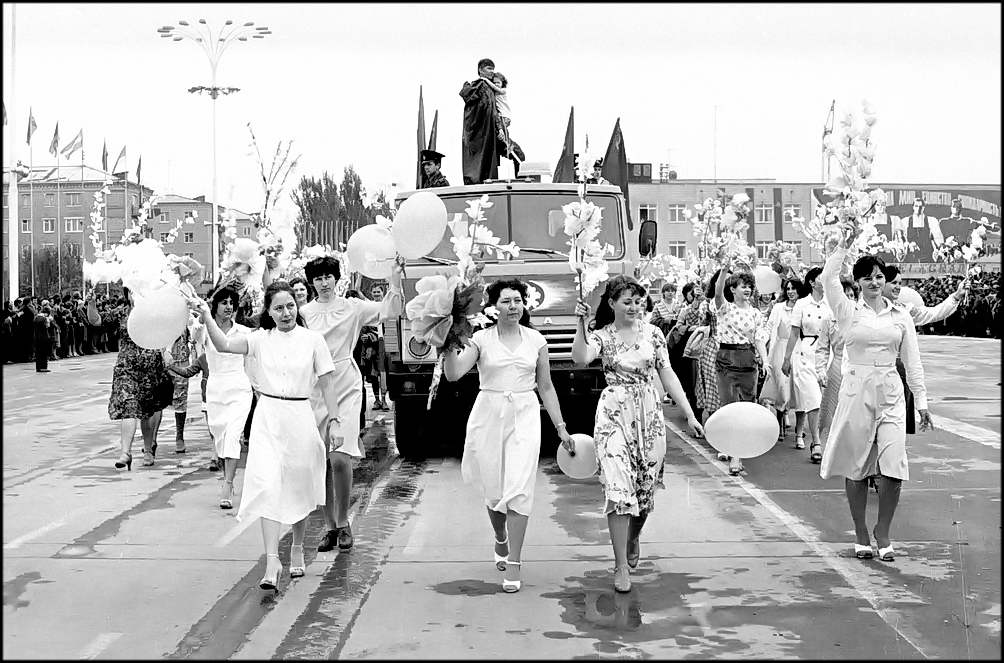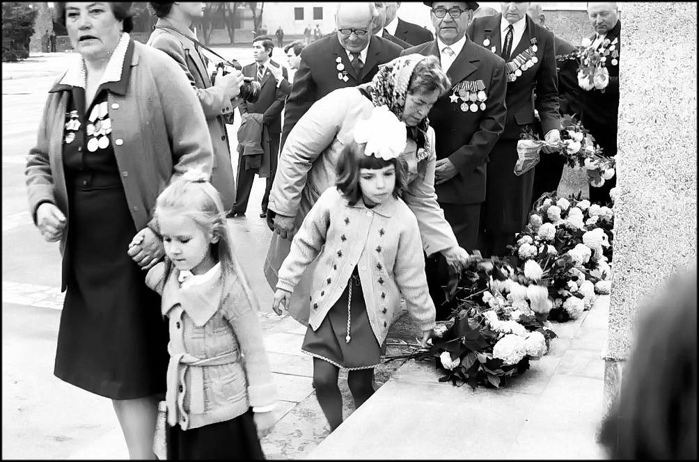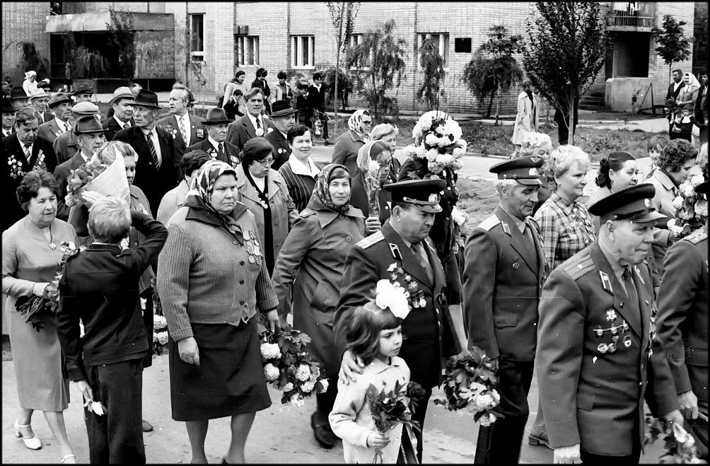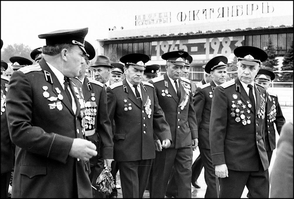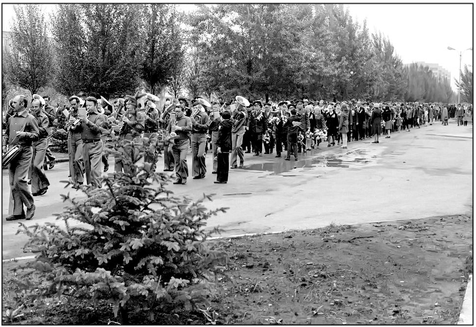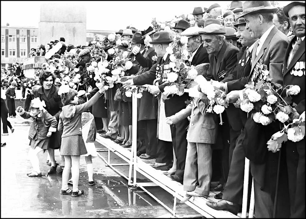Внимание! Говорит площадь Победы! Сегодня, 9 мая 1983 года, — 38-я годовщина Победы советского народа над фашистской Германией… И замерла в торжественном убранстве обновленная площадь города. Под звуки духового оркестра к ней направляется колонна ветеранов. ОНИ идут, как всегда, чеканя шаг, четко держа равнение. Идут по знакомым улицам города люди, которые прошли через горечь утрат, слезы, беды, через дни в свинцовой душной мгле. Люди, которые принесли миру победу от коричневой чумы. Идут ветераны… И блестят глаза от слез у старушек в черных платках:» «Здоровья вам, сынки». А перед глазами, устремленными вдаль, — стоят лица сыновей, мужей, оставшихся вечно молодыми, не вернувшихся с войны.