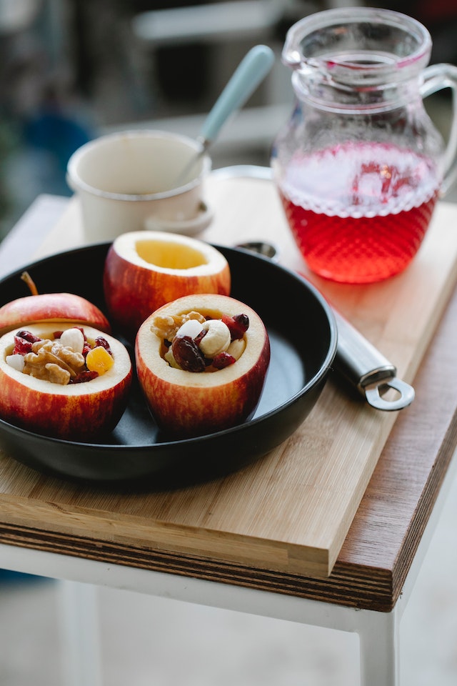 Запеченные яблоки с грецкими орехами, корицей и специями Ингредиенты: яблоки большие – 4 шт.; сливочное масло – 4 ч. ложки; грецкий орех – 1/4 стакана (рубленые); корица – 2 ч. ложки; молотый имбирь – 1 ч. ложка; молотый мускатный орех – 1/2 чайной ложки; сахар по вкусу; яблочный сидр – 1/2 стакана; ванильное мороженое (по желанию для подачи). Способ приготовления: предварительно разогрейте духовку. У яблок удалите сердцевины маленьким ножом или специальным устройством, поместите в форму для запекания. В небольшой миске смешайте масло, грецкие орехи, корицу, имбирь, мускатный орех и сахар по вкусу. Начините яблоки смесью в равных частях. На дно налейте яблочный сидр, чтобы не пригорели яблоки, и поставьте в духовку. Выпекайте 45-60 минут или пока яблоки не станут мягкими, поливая жидкостью для сковороды каждые 15 минут.