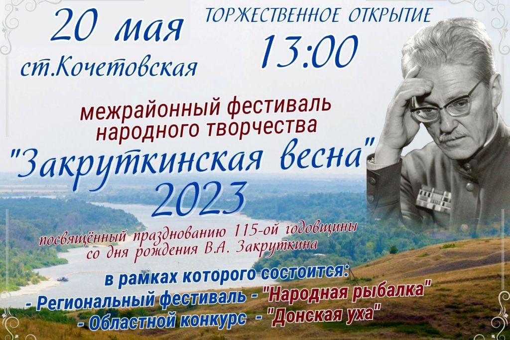 В День реки Дон, 20 мая, в станице Кочетовской Семикаракорского района пройдет межрайонный фестиваль народного творчества «Закруткинская весна-2023», посвященный 115-й годовщине со дня рождения писателя Виталия Закруткина. Одновременно на этой же территории пройдут фестиваль «Народная рыбалка» и областной конкурс «Донская уха».