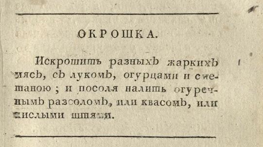 Первое упоминание о современной окрошке, как мы её знаем, относится к концу 18 века. В книге Николая Осипова «Старинная русская хозяйка, ключница и стряпуха» описывается рецепт, в котором предлагается мелко нарезать жареное мясо, лук и огурцы, затем заправить их сметаной и залить огуречным рассолом, квасом или кислыми щами. В качестве приправ добавлялись уксус, хрен, перец, горчица, сметана и растительное масло.