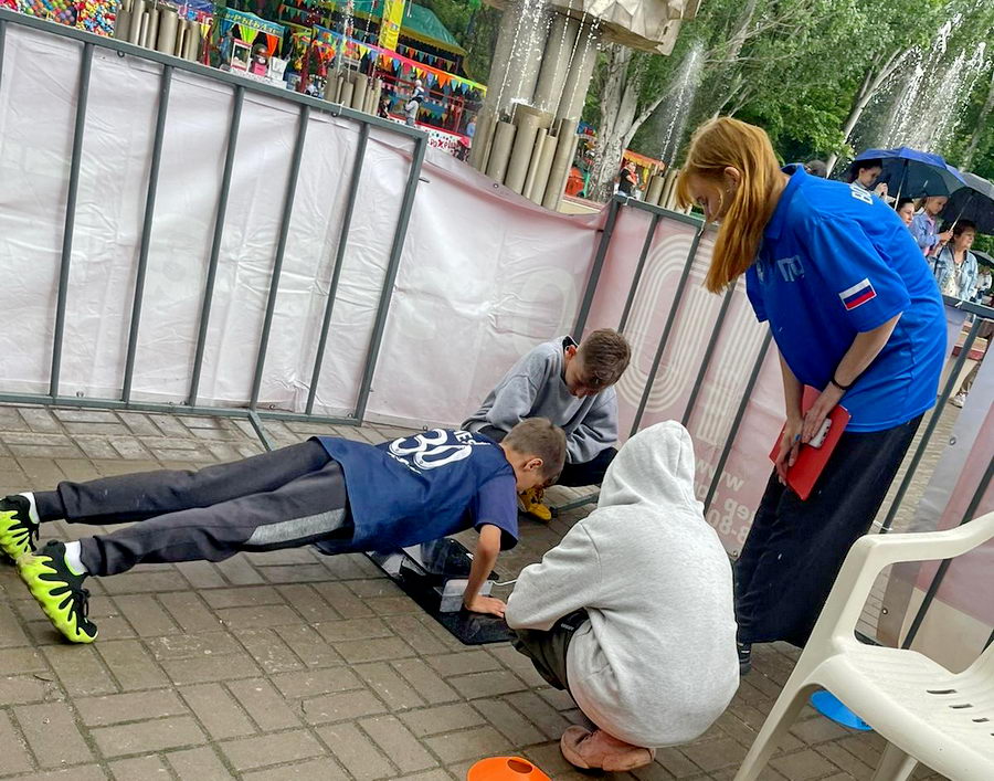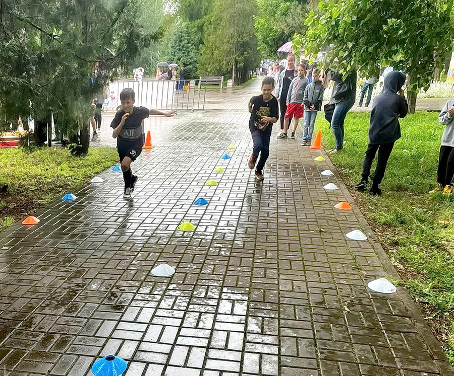 В парке «Победы» , не смотря на дождь, ребята попробовали свои силы в прыжке в длину с места, отжимании от платформы, наклонах, прессе за 1 минуту и челночном беге 3х10 метров.