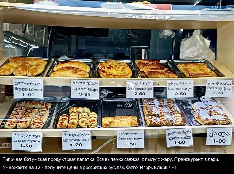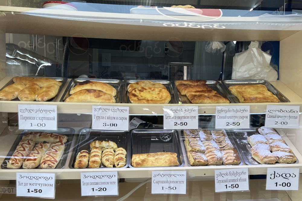 Типичная батумская продуктовая палатка. Вся выпечка свежая, с пылу с жару. Прейскурант в лари. Умножайте на 32 — получите цены в российских рублях. Фото: Игорь Елков / РГ
