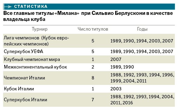 Под предводительством Сильвио «Милан» выиграл 29 трофеев, восемь раз став чемпионом Италии и пять раз победил в Лиге чемпионов. Самым запоминающимся наверняка был финал в 2007 году, когда «красно-черные» взяли реванш у «Ливерпуля» за поражение двухгодичной давности в Стамбуле. Так вот, в Афинах Берлускони единственный раз поднимал кубок над головой вместе с футболистами — после этого «россонери» не завоевывали главный еврокубок…
