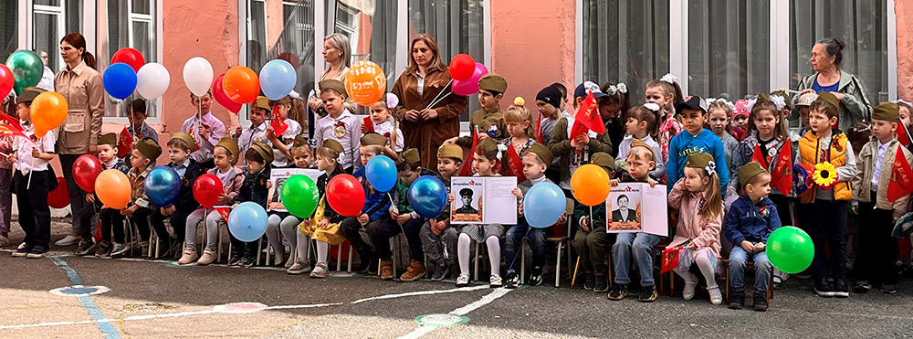А самым ярким и трогательным событием стал парад Победы в любимом детском саду. В солдатских пилотках, с флажками и шарами прошли воспитанники в парадном строю и шествии «Бессмертный полк» с портретами своих родных. Со слезами на глазах за малышами наблюдали их родители.