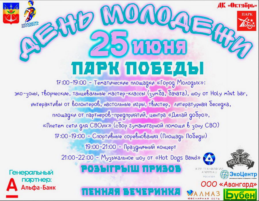 Основные мероприятия, посвященные празднованию Дня молодежи в России, пройдут в Волгодонске 25 июня в парке Победы. Организаторы обещают интересную развлекательную программу с работой тематических площадок, интерактивами, спортивными и интеллектуальными играми, розыгрышем призов, праздничным концертом и даже с пенной вечеринкой! Начало с 17.00.