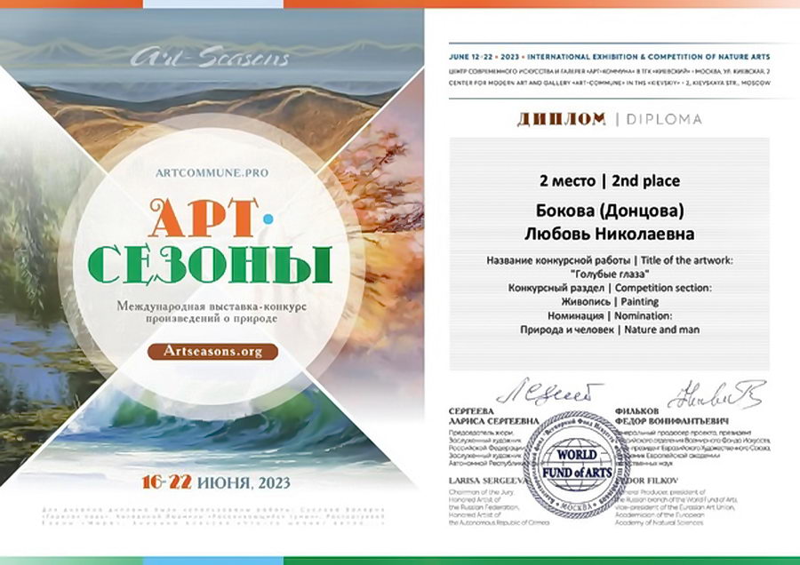 В Москве в Центре современного искусства и галерее «Арт-Коммуна» проводилась международная выставка-конкурс произведений о природе, Волгодонская художница Любовь Донцова заняла 2 место в номинации «Природа и человек» с работой «Голубые глаза».