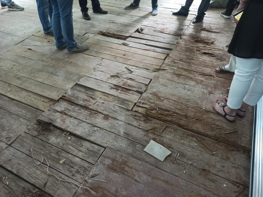 Полной замены здесь, разумеется, требуют полы – черновые полы прогнили и по ним местами довольно страшно ходить. Стены, с которых сейчас сбивают краску, оказались оштукатурены известковой штукатуркой с большим содержанием песка – никакая финишная отделка на ней не удержится. И наконец, новые навесные потолки планировалось делать из гипсокартона, но, по словам строителей, крепить его на старые слишком длинные потолочные балки нельзя – они прогнутся. Значит, нужно уже по ходу работ придумывать альтернативу.