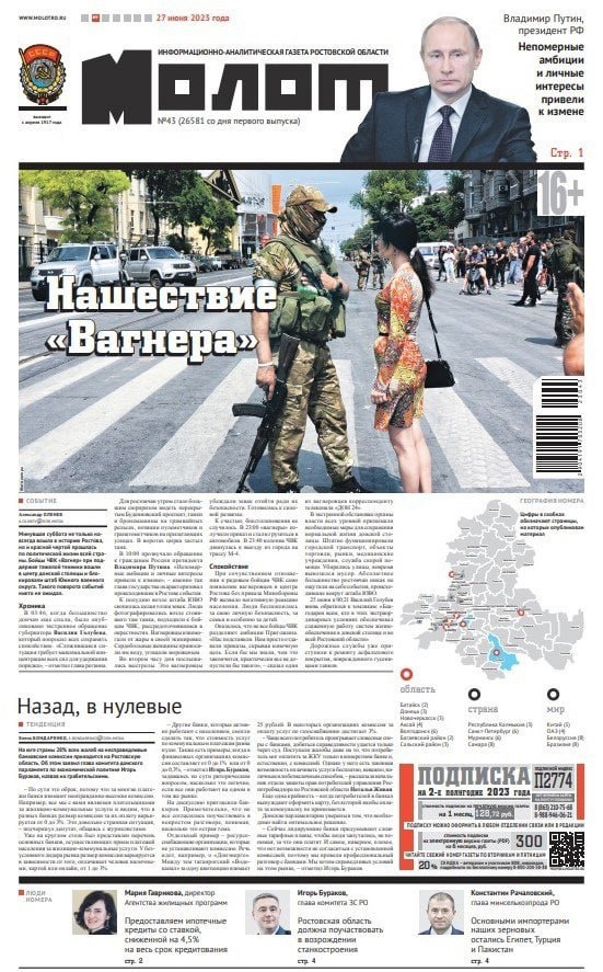 По результатам голосования лучшей обложкой июня среди российских газет признана первая полоса ростовской областной газеты «Молот».