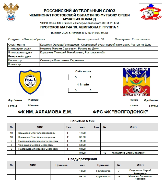 Сегодня, 15 июля футбольный клуб «Волгодонск» играл на выезде с командой ФК имени Е.М. Ахламова в посёлке Приморский Неклиновского района. Увы, очередной проигрыш волгодонской команды и вновь с крупным счётом 1: 5.
