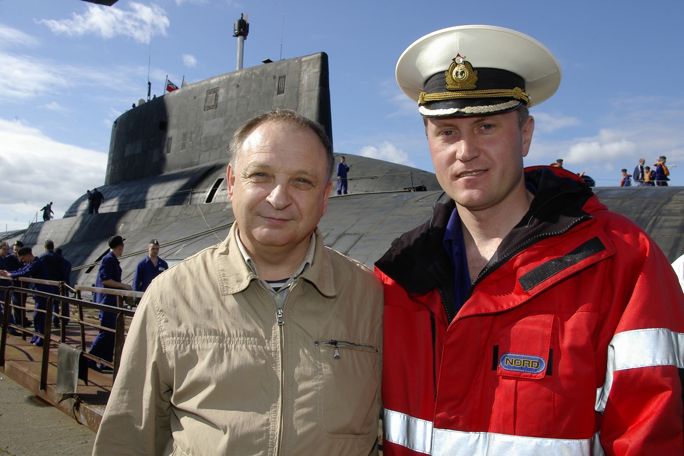 Это не фотомонтаж, а реальное фото, сделанное в Северодвинске, 2007 год. На заднем плане — «Дмитрий Донской». Увы, но больше его жители города не увидят — выйти в море подлодка уже не сможет. Фото: ПО «Севмаш»