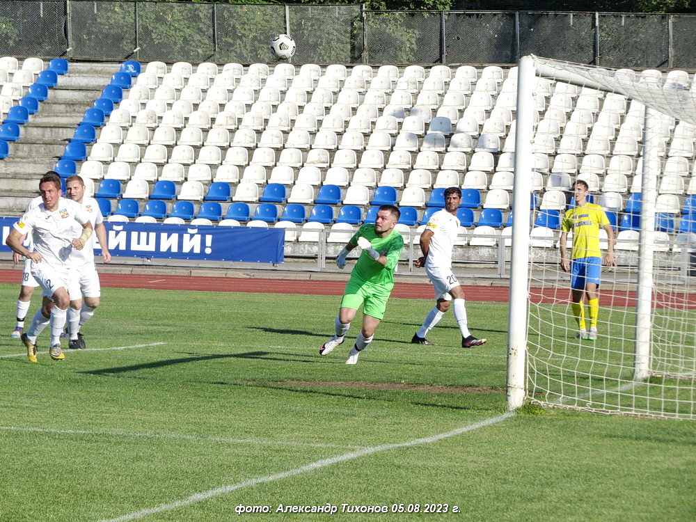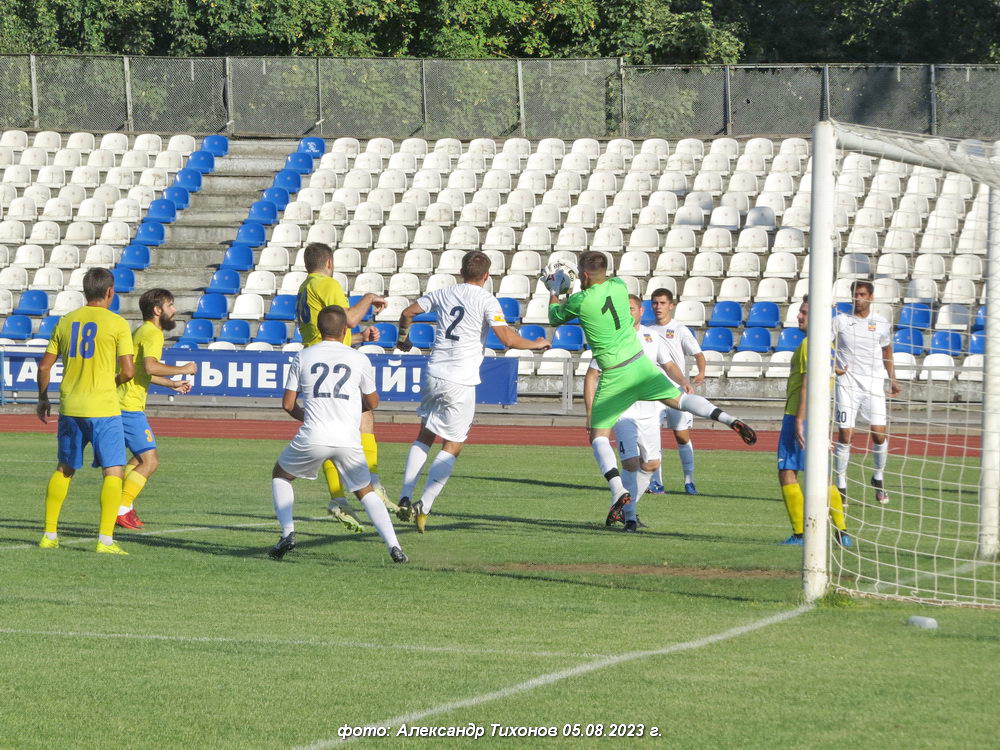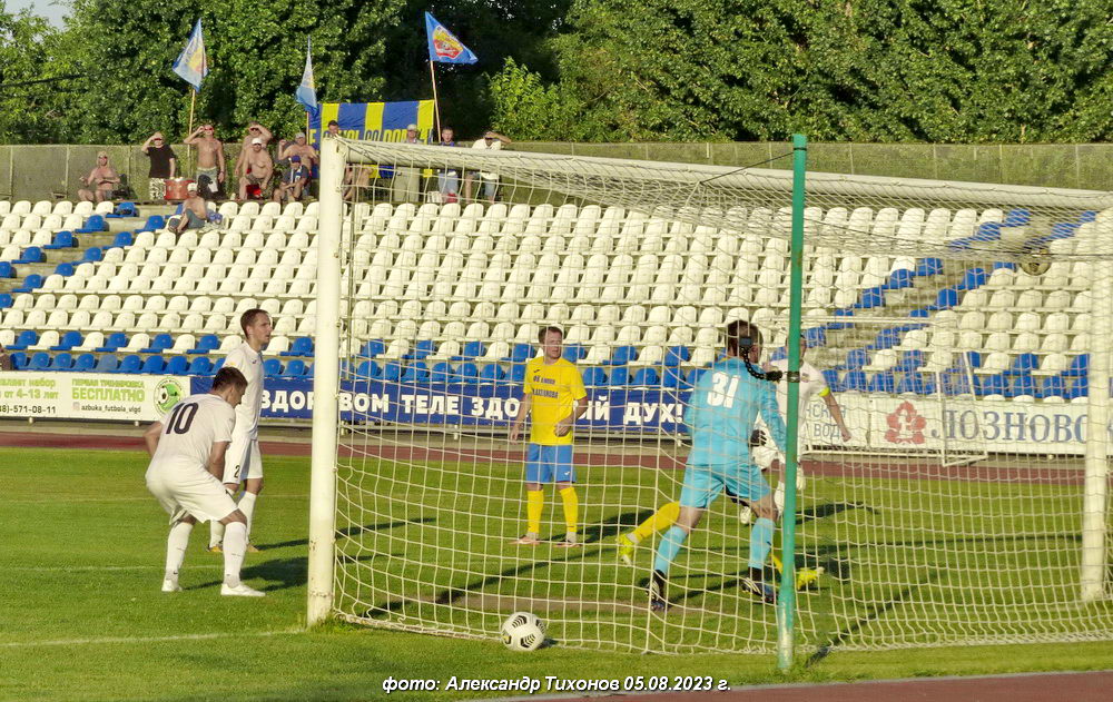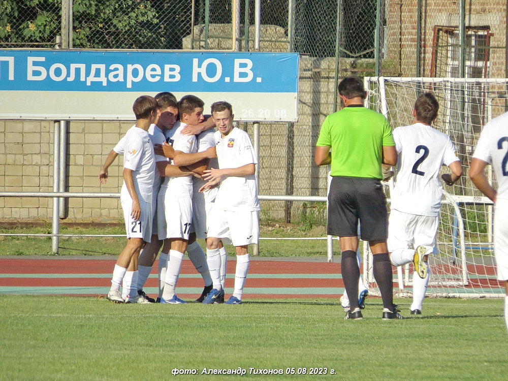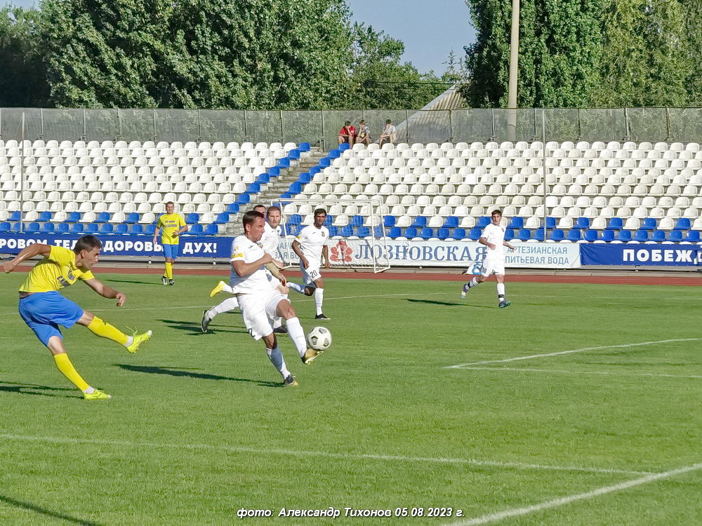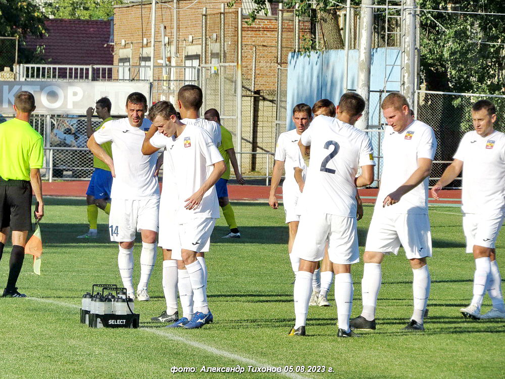 Сразу после «водопоя» ( командам в жаркую погоду даётся минутный перерыв в каждом тайме, где игроки могут попить водички у кромки поля) волгодонцы открывают счёт, и, буквально через десяток секунд гости смогли отыграться. 1: 1 — после первого тайма.