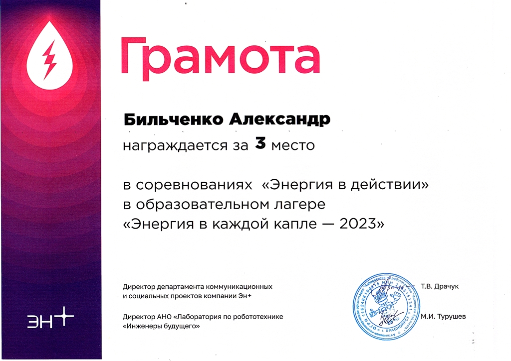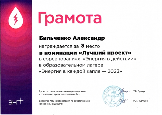 Кроме того, Александр Бильченко по итогам образовательного лагеря получил удостоверение о повышении квалификации в объёме 72 часа по программе «Формирование STEAM-компетенций у школьников в проектно-конструкторской деятельности через преподавание образовательной робототехники». Егор Даричев получил приглашение участвовать в соревнованиях «Энергия в действии» в сезоне 2023-2024 года (отборочные этапы соревнований пройдут в декабре-феврале в Иркутске, Екатеринбурге и Московской области, финал состоится весной 2024 года в Красноярске).
