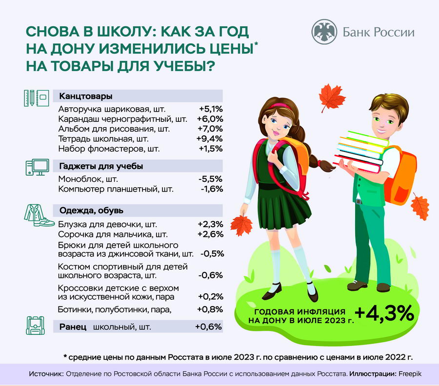 Накануне Дня знаний эксперты Банка России в Ростовской области решили выяснить, какие товары для школьников дорожают, какие дешевеют и почему это происходит. Они проанализировали, как на Дону за год изменились цены на канцелярские принадлежности, рюкзаки, повседневную и спортивную одежду, обувь и компьютерную технику. То есть на стандартный набор того, что необходимо купить к началу учебного года.