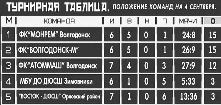 Соперники волгодончан с тремя очками, вместе с командой «Восток-ДЮСШ» из Орловского района делят последние места открытого чемпионата. Но спорт есть спорт. И можно ожидать любого результата. Ведь преподнесли же сюрприз футболисты Орловского района выиграв у действующего чемпиона Волгодонска «Монрема». Вот так на сегодня выглядит турнирная таблица чемпионата: