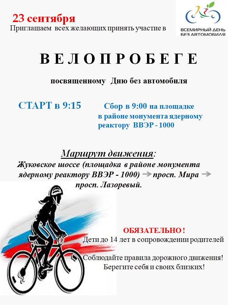В Волгодонске День без автомобиля в этом году отметят в субботу, 23 сентября, традиционным велопробегом. Сбор – в 9 утра от монумента атомному реактору ВВЭР-1000 на Жуковском шоссе. Старт – в 9.15. Маршрут пройдет по проспекту мира и проспекту Лазоревому.