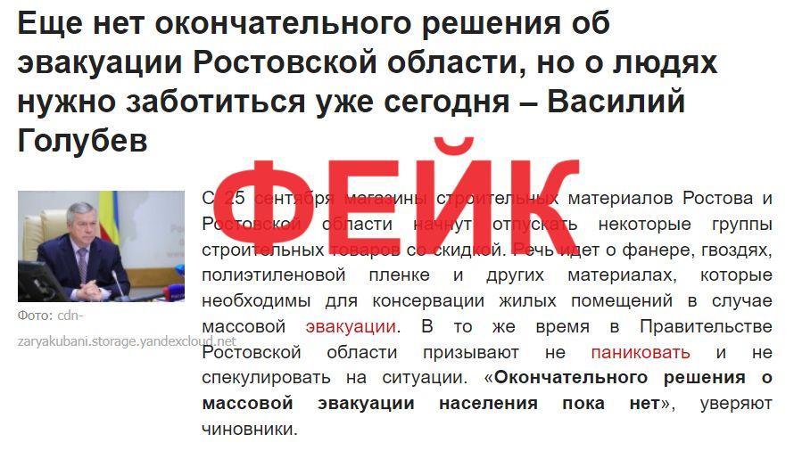 Телеграм-канал «Война с фейками. Ростов» обращает внимание жителей Ростовской области на то, что ни на официальном сайте правительства региона, ни в соцсетях губернатора, ни в интернет-ресурсах, имеющих отношение к СКЖД, никакой информации об эвакуации нет и не было. Да и какой для нее повод, собственно? Кроме того, публикация новости об эвакуации жителей Ростовской области на интернет-ресурсах Краснодарского края также вызывает удивление – какое отношение тот же Славянск-на-Кубани имеет к донскому региону? Вывод напрашивается очевидный – у нас очередной фейк, основная задача которого – разгон панических настроений среди населения.