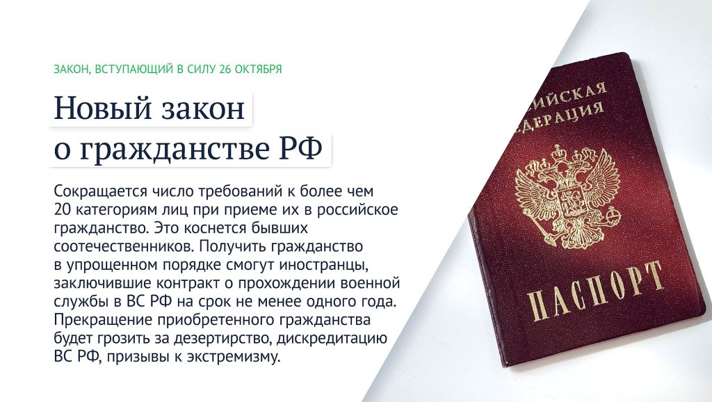 Сокращается число требований к более чем 20 категориям лиц при приеме их в российское гражданство. Это коснется бывших соотечественников. Получить гражданство в упрощенном порядке смогут иностранцы, заключившие контракт о прохождении военной службы в ВС РФ на срок не менее одного года. Прекращение приобретенного гражданства будет грозить за дезертирство, дискредитацию ВС РФ, призывы к экстремизму.