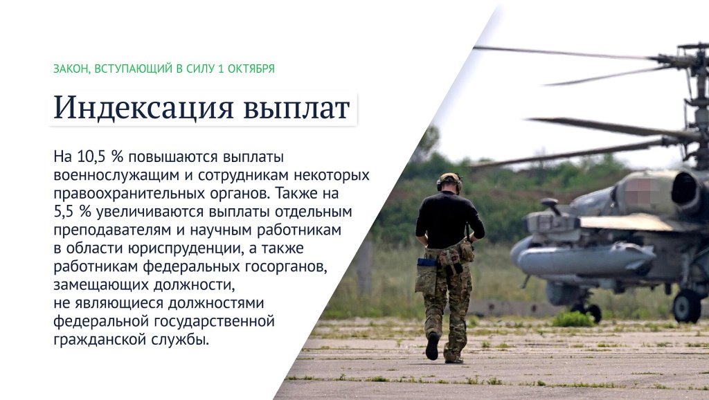 На 10,5 % повышаются выплаты военнослужащим и сотрудникам некоторых правоохранительных органов. Также на 5,5 % увеличиваются выплаты отдельным преподавателям и научным работникам в области юриспруденции, а также работникам федеральных госорганов, замещающих должности, не являющиеся должностями федеральной государственной гражданской службы.