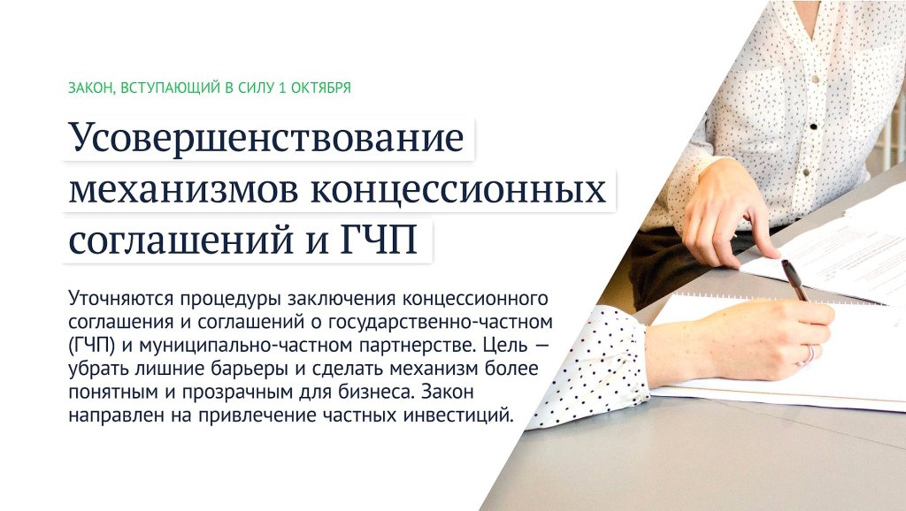 Уточняются процедуры заключения концессионного соглашения и соглашений о государственно-частном (ГЧП) и муниципально-частном партнерстве. Цель — убрать лишние барьеры и сделать механизм более понятным и прозрачным для бизнеса. Закон направлен на привлечение частных инвестиций.