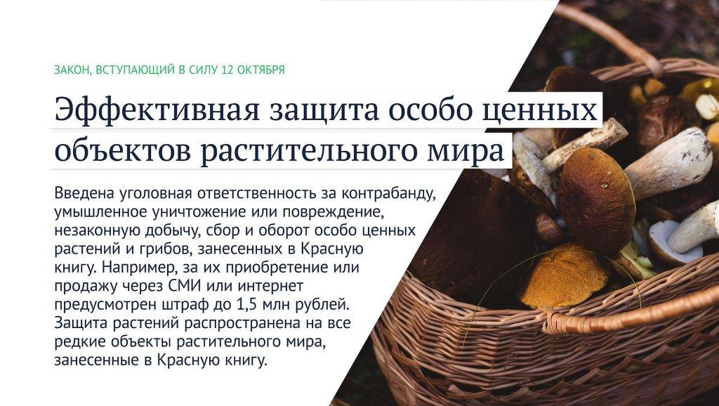 Введена уголовная ответственность за контрабанду, умышленное уничтожение или повреждение, незаконную добычу, сбор и оборот особо ценных растений и грибов, занесенных в Красную книгу. Например, за их приобретение или продажу через СМИ или интернет предусмотрен штраф до 1,5 млн рублей. Защита растений распространена на все редкие объекты растительного мира, занесенные в Красную книгу.