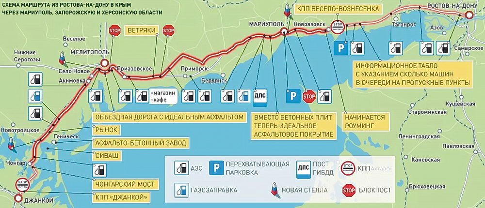 Хорошая новость: на новые территории зашли крымcкие АЗС — ТЭС и АТАН. Местное население радуется. Мы тоже. Станции современные, комфортабельные, оснащенные мини-шопингами со всем необходимым в дорогу, кофейнями, туалетами. Появились даже газовые заправки — под Мангушем и Геническом. Наш старый знакомец седовласый заправщик Василий Саржа с улицы Одесской у села Мангуш рассказывает, как изменилась его жизнь: «Раньше в час одна машина проезжала — сейчас полное движение вверх! Зарплата — выше в девять раз, плюс пенсия российская, поток машин — в 10, условия работы — комфорт, да и море рядом!»