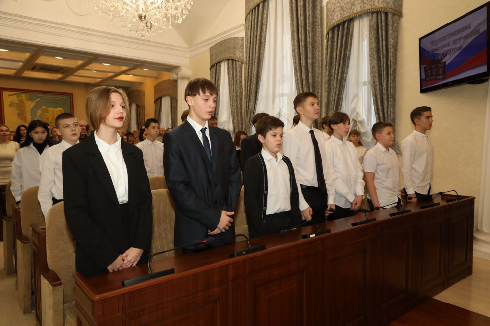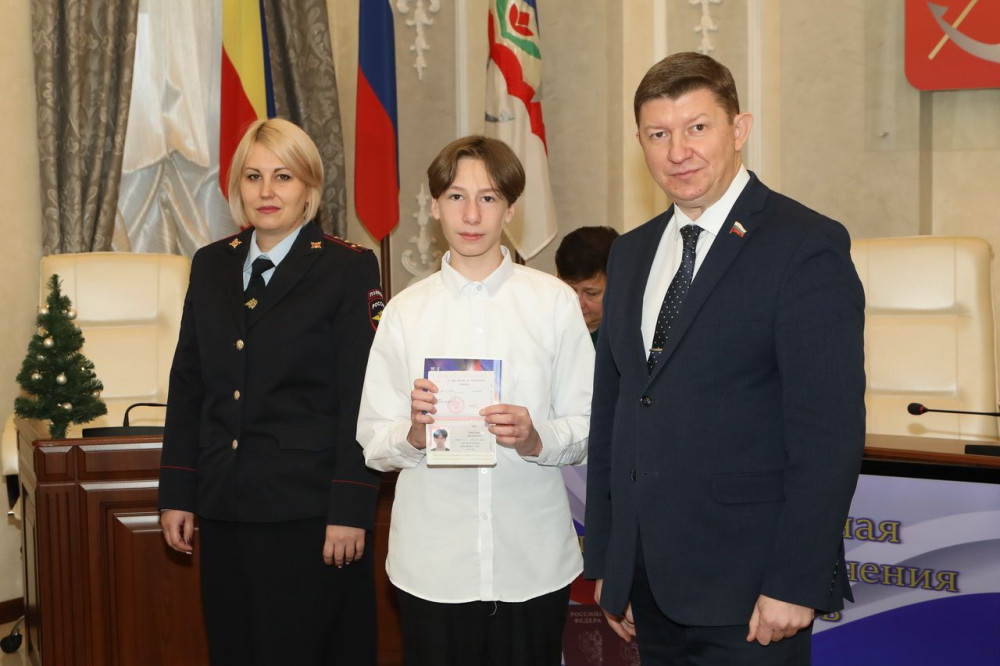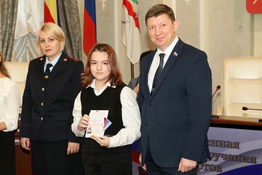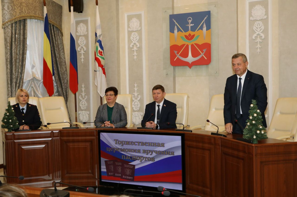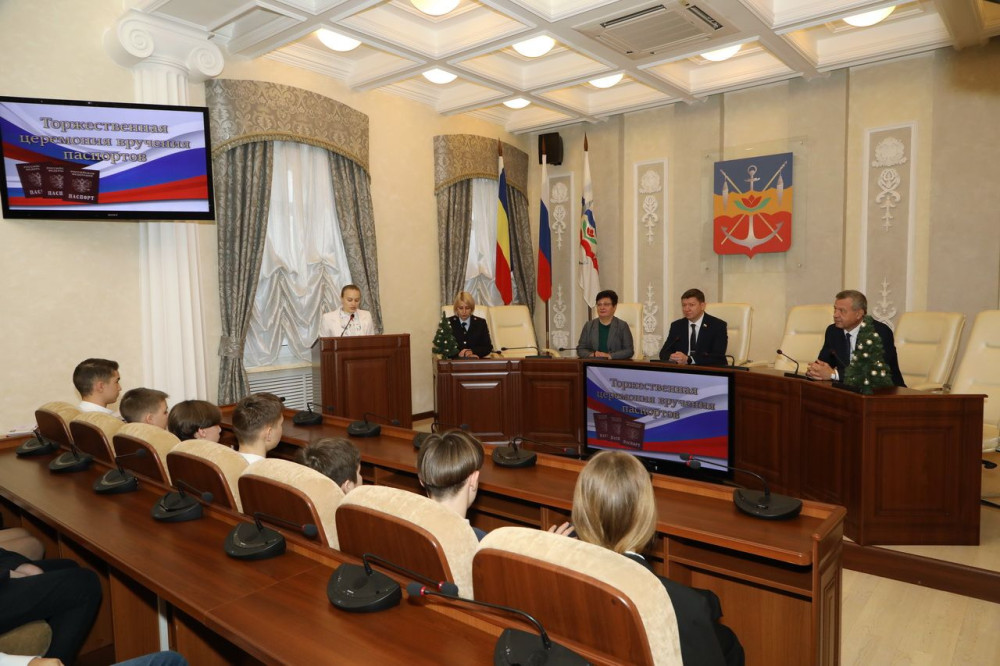 На церемонии в зале заседаний администрации города присутствовали председатель Волгодонской городской Думы – глава города Волгодонска Сергей Ладанов, заместитель главы администрации города Волгодонска по социальному развитию Андрей Пашко, начальник Управления образования города Волгодонска Татьяна Самсонюк, заместитель начальника — начальник паспортного отделения отдела по вопросам миграции МУ МВД «Волгодонское», майор полиции Наталья Польшкова, педагоги и родители школьников.