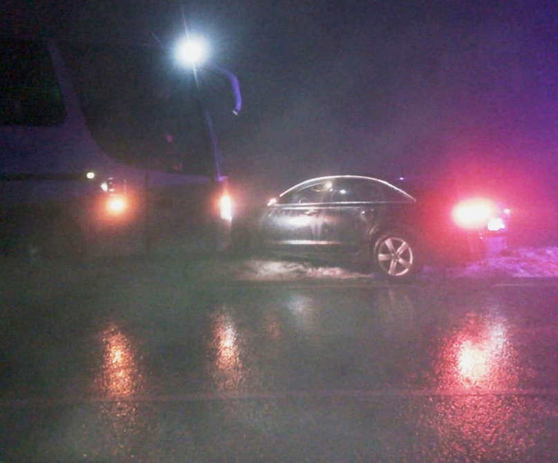 Автобус съехал за пределы проезжей части, прихватив с собой Ауди. К счастью, никто не пострадал.