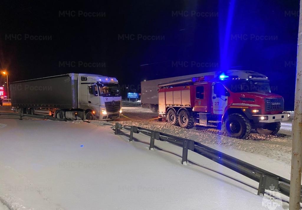 Водителям и пассажирам помогают спасатели. На трассе организовано мобильное патрулирование службами ЧС. Развернуто 5 пунктов обогрева и питания: на 995 км на базе автобуса ПАЗ; на 939 км на базе автомобиля ГАЗ-66; на 983 км на базе автомобиля ЗИЛ-131; на 994 км на базе автомобиля ЗИЛ-131; на 979 км на базе автобуса КАВЗ.