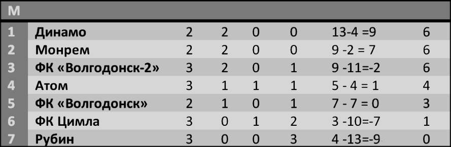 После двух туров чемпионата впереди команды «Монрем» -6 очков, «Атом» — 4 очка. Команды «Динамо» и Ф/К «Волгодонск-2» имели по 3 очка.