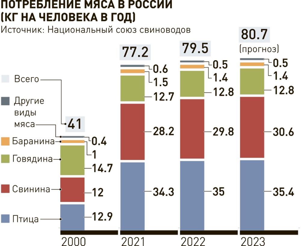 Весь вопрос в том, каковы будут аппетиты россиян в 2024 году и как будет развиваться экспорт. По оценкам Россельхозбанка, в этом году рекорд потребления мяса снова будет побит и составит минимум 83 кг на человека в год, то есть вырастет еще примерно на 3%.