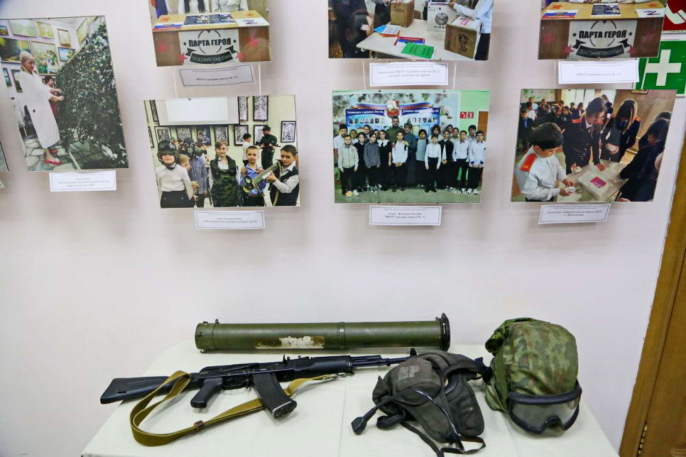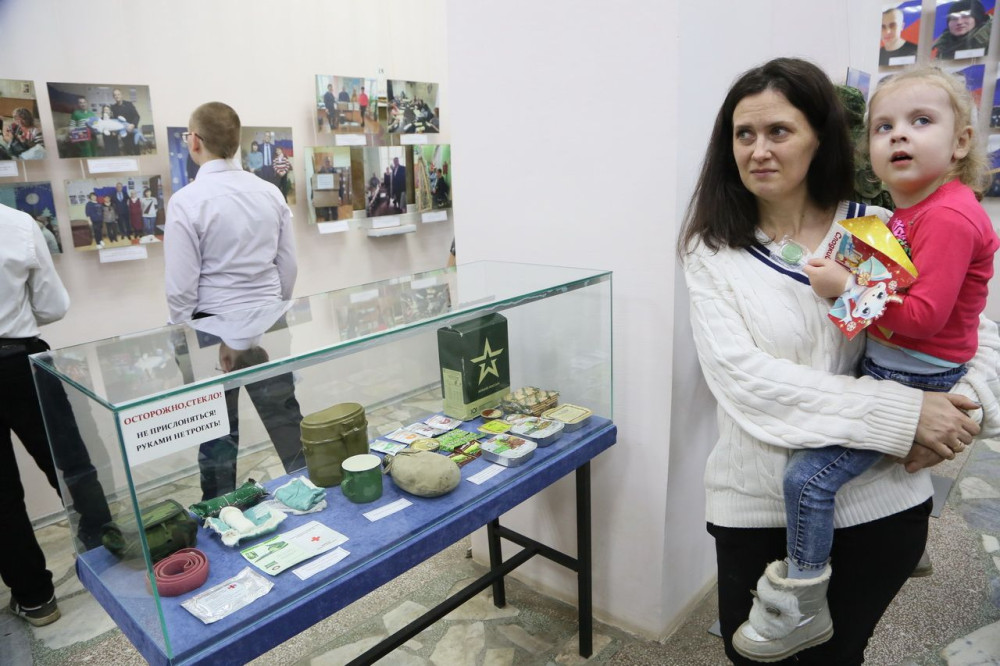 Помимо портретов героев представлены фотографии, на которых запечатлена волонтёрская деятельность населения: сбор и доставка гуманитарной помощи фронту, производство маскировочных сетей, и других предметов необходимости.