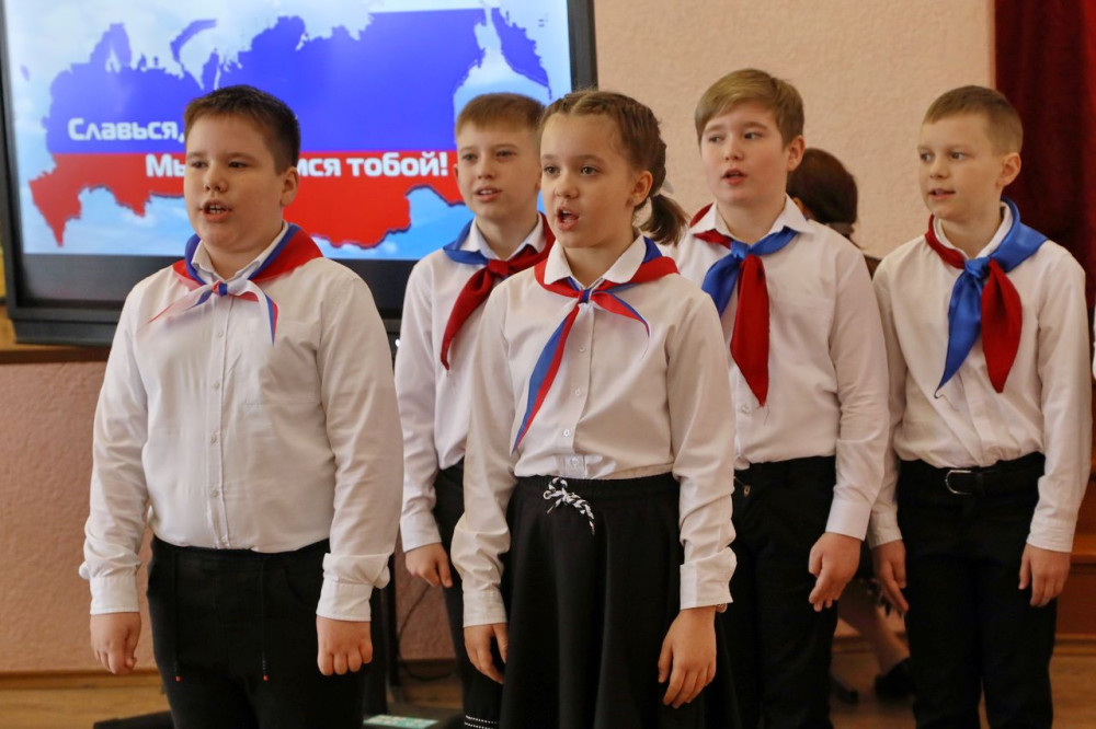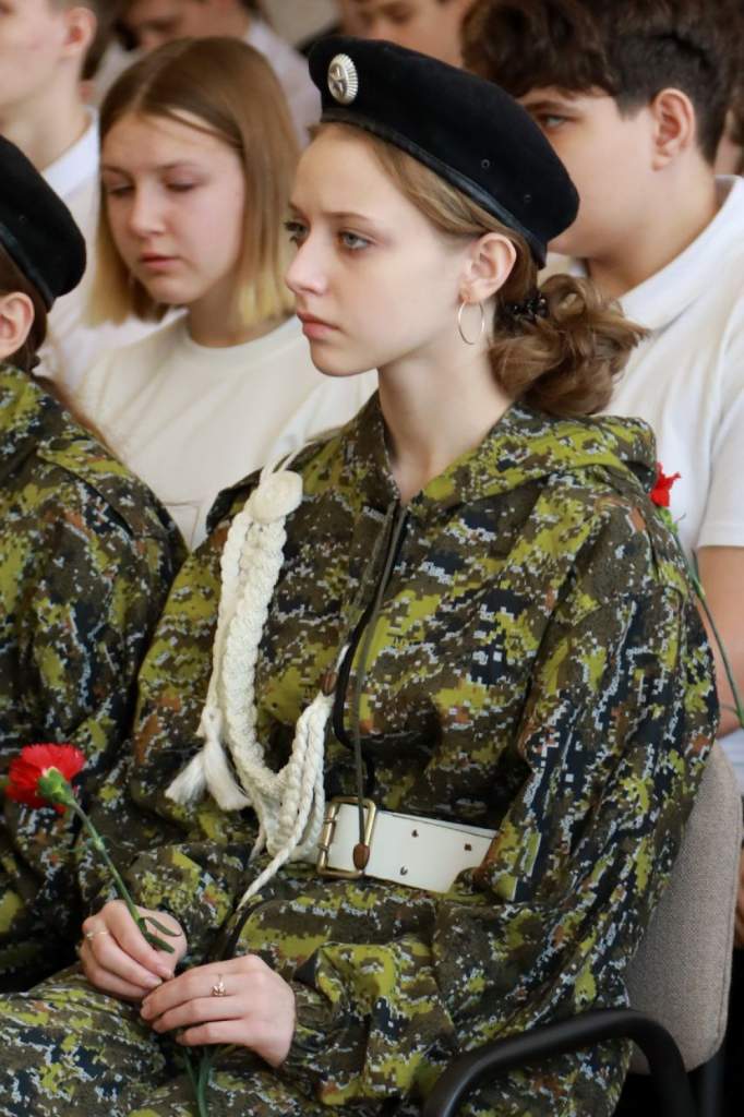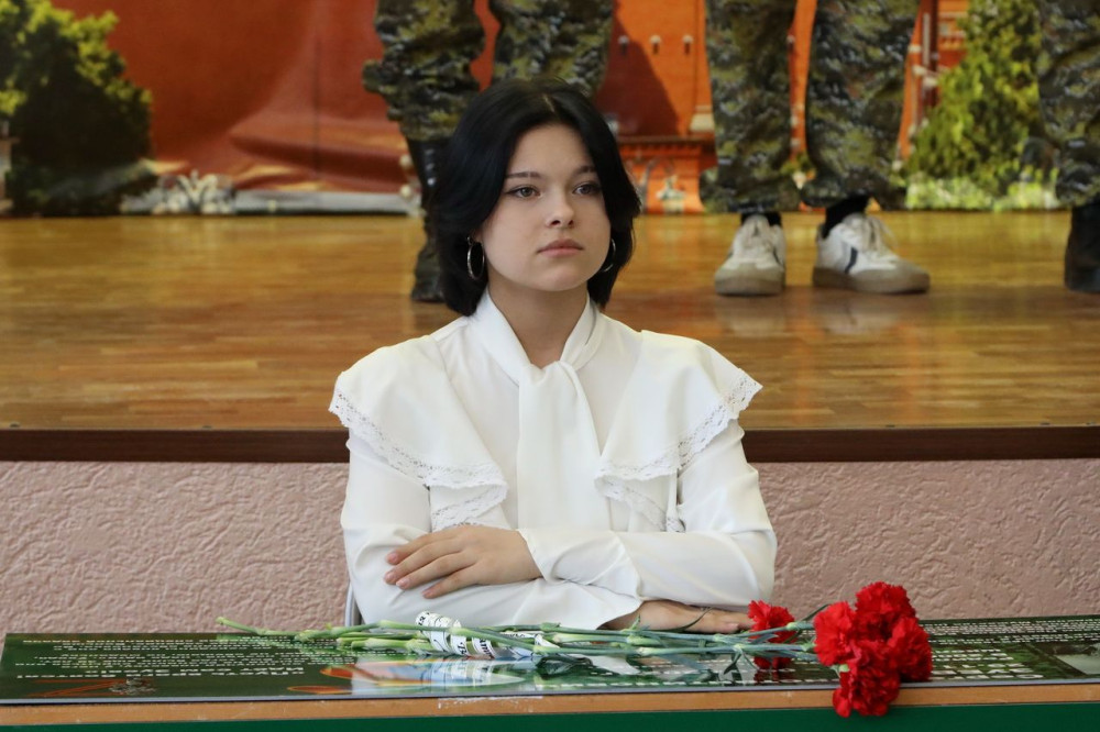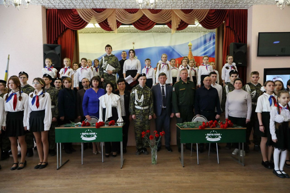 Учащиеся школы показали патриотичные и трогательные творческие номера, а лучшие ученики школы — Арсений Захаров и Виктория Пономарева -были удостоены чести первыми сесть за парты героев. Ребята признались, что это для них — огромная честь.