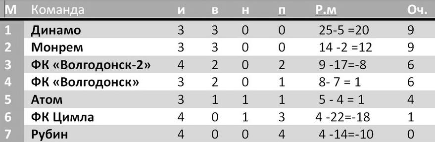 После пятого тура «Динамо» единоличный лидер -12 очков. У футбольных клубов «Монрем» и «Волгодонск» по 9 очков.